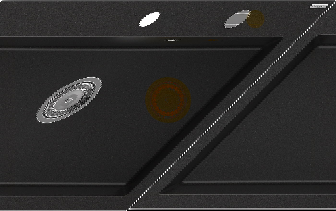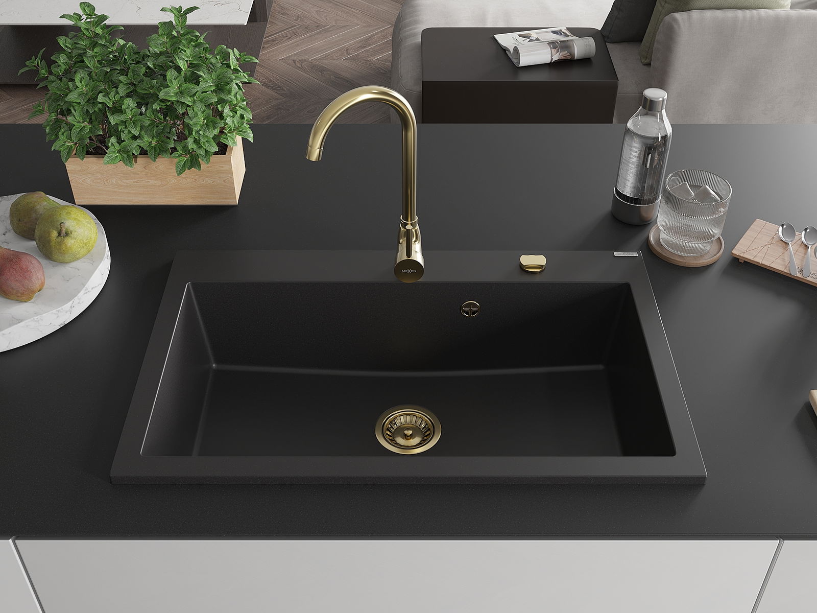 Mexen Elix νεροχύτης γρανίτη 1-θάλαμος 800 x 500 mm, μαύρο, σιφόνι χρυσό