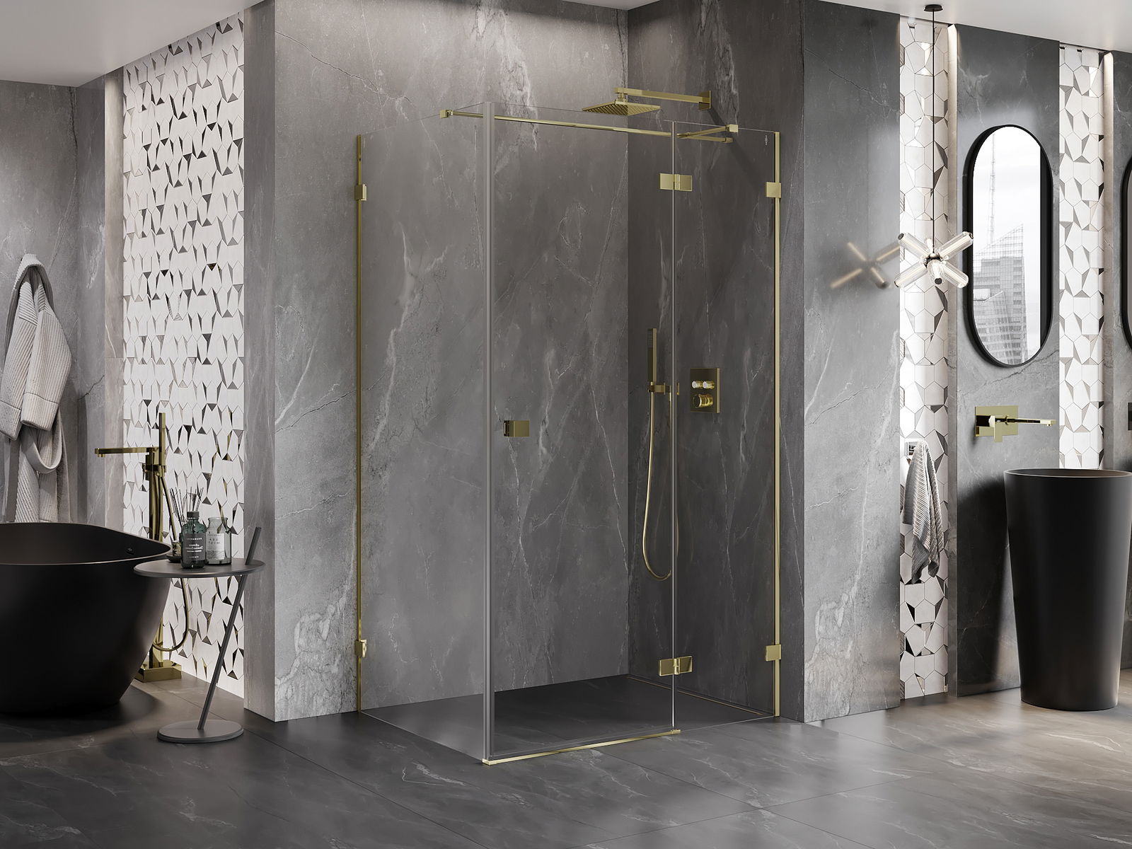 Οι σφιγκτήρες και οι μεντεσέδες είναι κατασκευασμένοι από πολύ ανθεκτικό ορείχαλκο και επιπλέον δημιουργούν μια ευθυγραμμισμένη επιφάνεια γυαλιού. Είναι μια εξαιρετική επιλογή που συνδυάζει κομψότητα, ανθεκτικότητα και σύγχρονο σχεδιασμό. Χάρη σε αυτές τις λύσεις, η ντουζιέρα κερδίζει σε αισθητική και ταυτόχρονα διευκολύνουν τη διατήρηση της καθαριότητας.