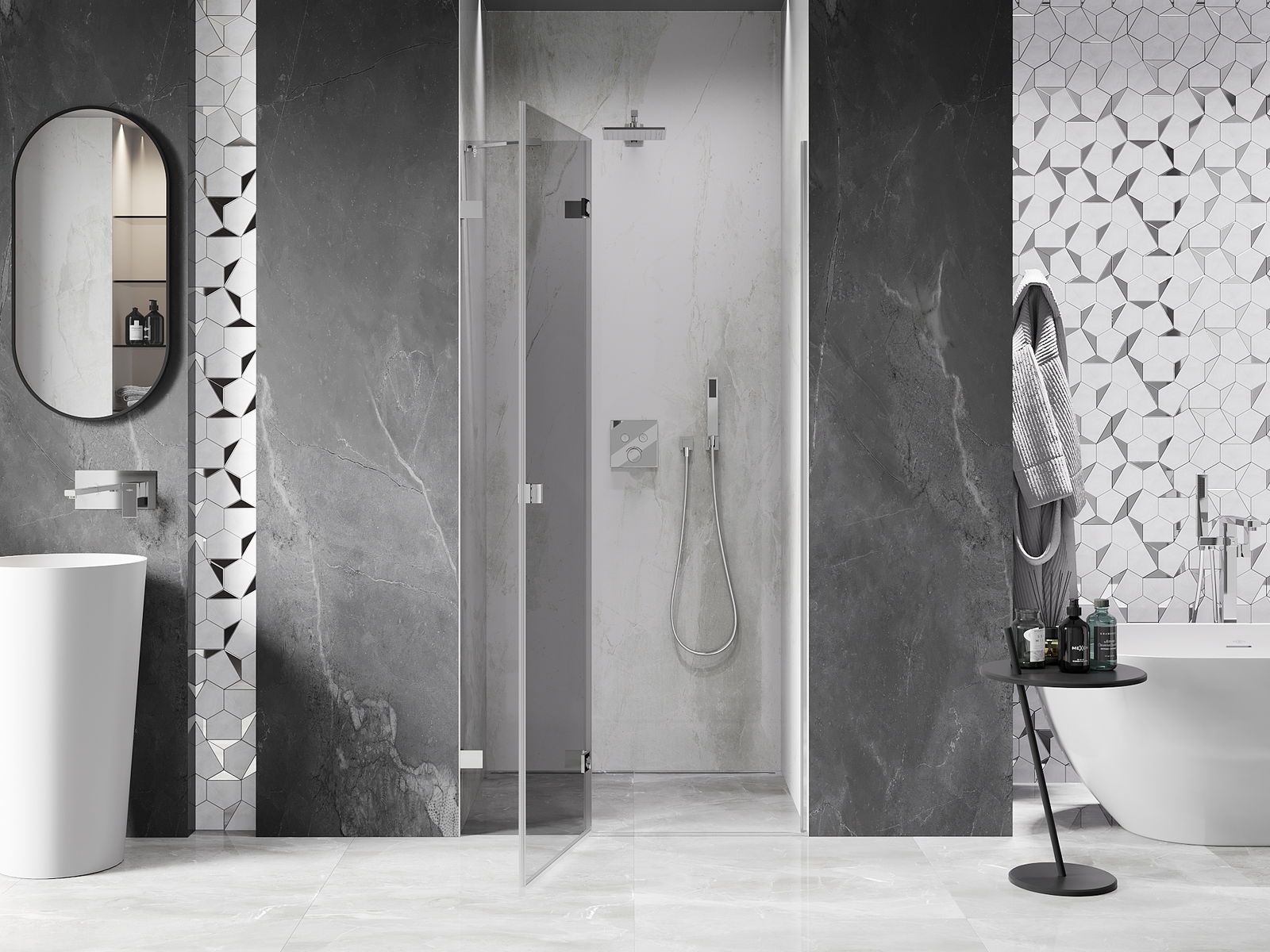 Η πρακτική και άνετη λαβή κατασκευάζεται από ανθεκτικό και αντοχής μέταλλο. Ο μοντέρνος σχεδιασμός σε συνδυασμό με το φινίρισμα που ταιριάζει με το χρώμα των προφίλ προσδίδει στο σύνολο μια σύγχρονη και κομψή εμφάνιση, τονίζοντας την αισθητική κάθε μπάνιου.