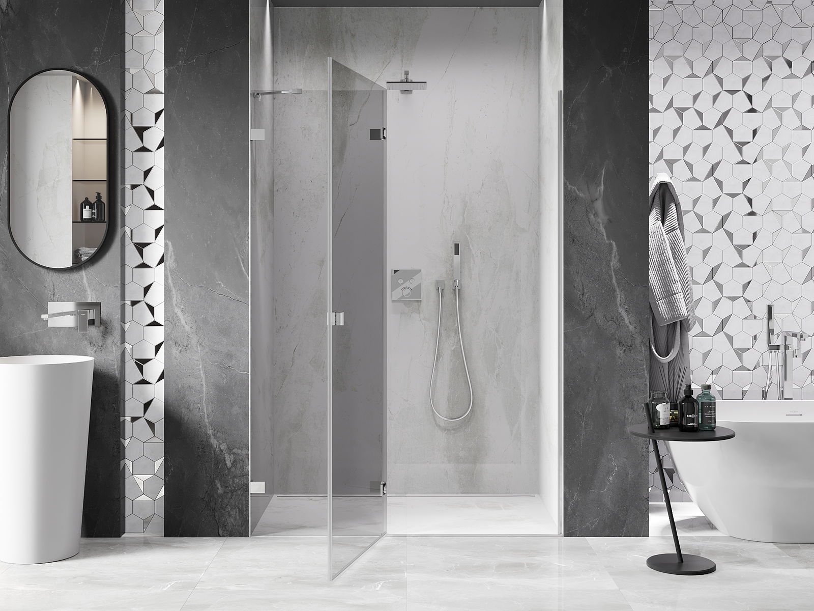 Οι σφιγκτήρες και οι μεντεσέδες είναι κατασκευασμένοι από πολύ ανθεκτικό ορείχαλκο και επιπλέον δημιουργούν μια ευθυγραμμισμένη επιφάνεια γυαλιού. Είναι μια εξαιρετική επιλογή που συνδυάζει κομψότητα, ανθεκτικότητα και σύγχρονο σχεδιασμό. Χάρη σε αυτές τις λύσεις, η ντουζιέρα κερδίζει σε αισθητική και ταυτόχρονα διευκολύνουν τη διατήρηση της καθαριότητας.