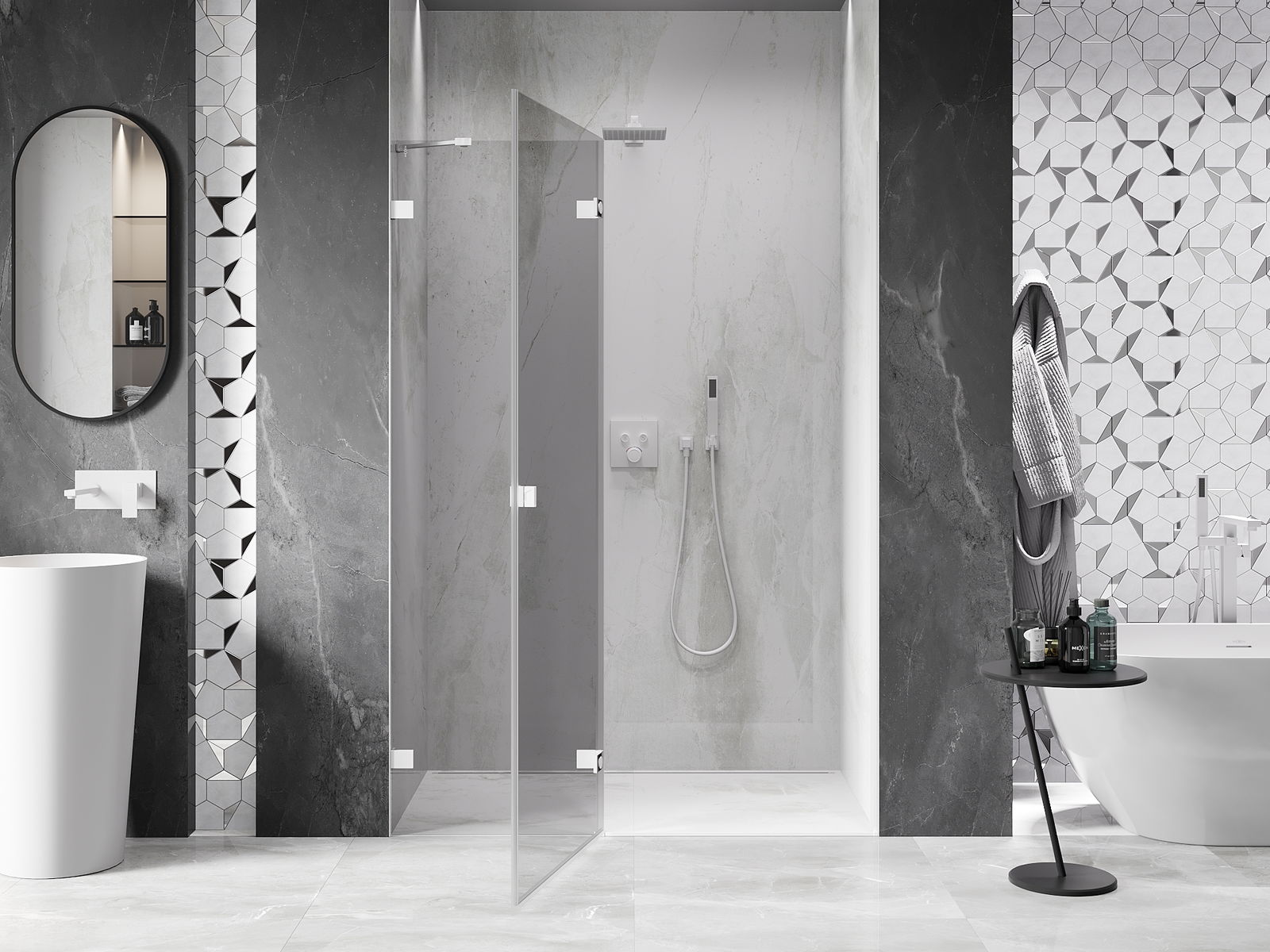Οι σφιγκτήρες και οι μεντεσέδες είναι κατασκευασμένοι από πολύ ανθεκτικό ορείχαλκο και επιπλέον δημιουργούν μια ευθυγραμμισμένη επιφάνεια γυαλιού. Είναι μια εξαιρετική επιλογή που συνδυάζει κομψότητα, ανθεκτικότητα και σύγχρονο σχεδιασμό. Χάρη σε αυτές τις λύσεις, η ντουζιέρα κερδίζει σε αισθητική και ταυτόχρονα διευκολύνουν τη διατήρηση της καθαριότητας.