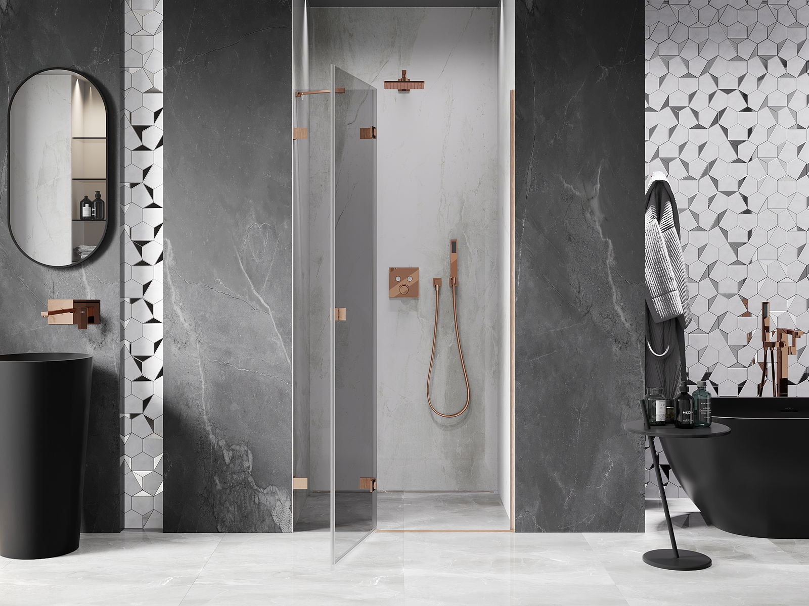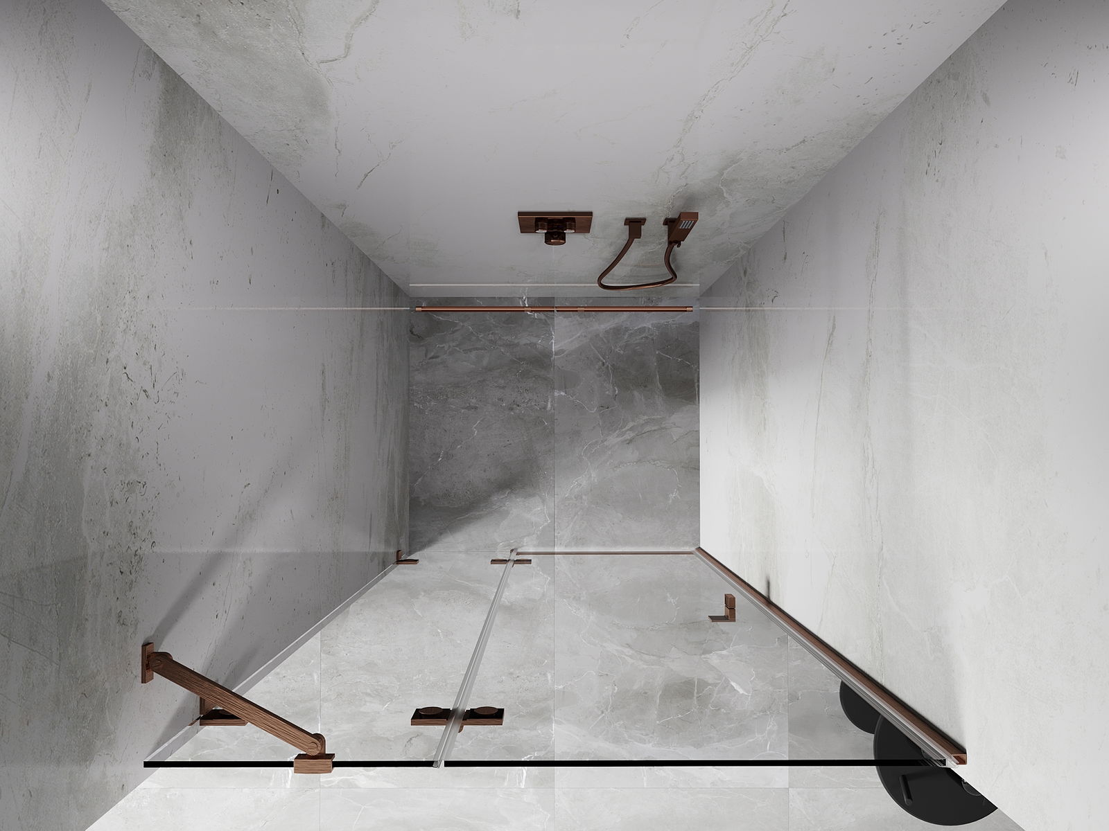 Οι σφιγκτήρες και οι μεντεσέδες είναι κατασκευασμένοι από πολύ ανθεκτικό ορείχαλκο και επιπλέον δημιουργούν μια ευθυγραμμισμένη επιφάνεια γυαλιού. Είναι μια εξαιρετική επιλογή που συνδυάζει κομψότητα, ανθεκτικότητα και σύγχρονο σχεδιασμό. Χάρη σε αυτές τις λύσεις, η ντουζιέρα κερδίζει σε αισθητική και ταυτόχρονα διευκολύνουν τη διατήρηση της καθαριότητας.