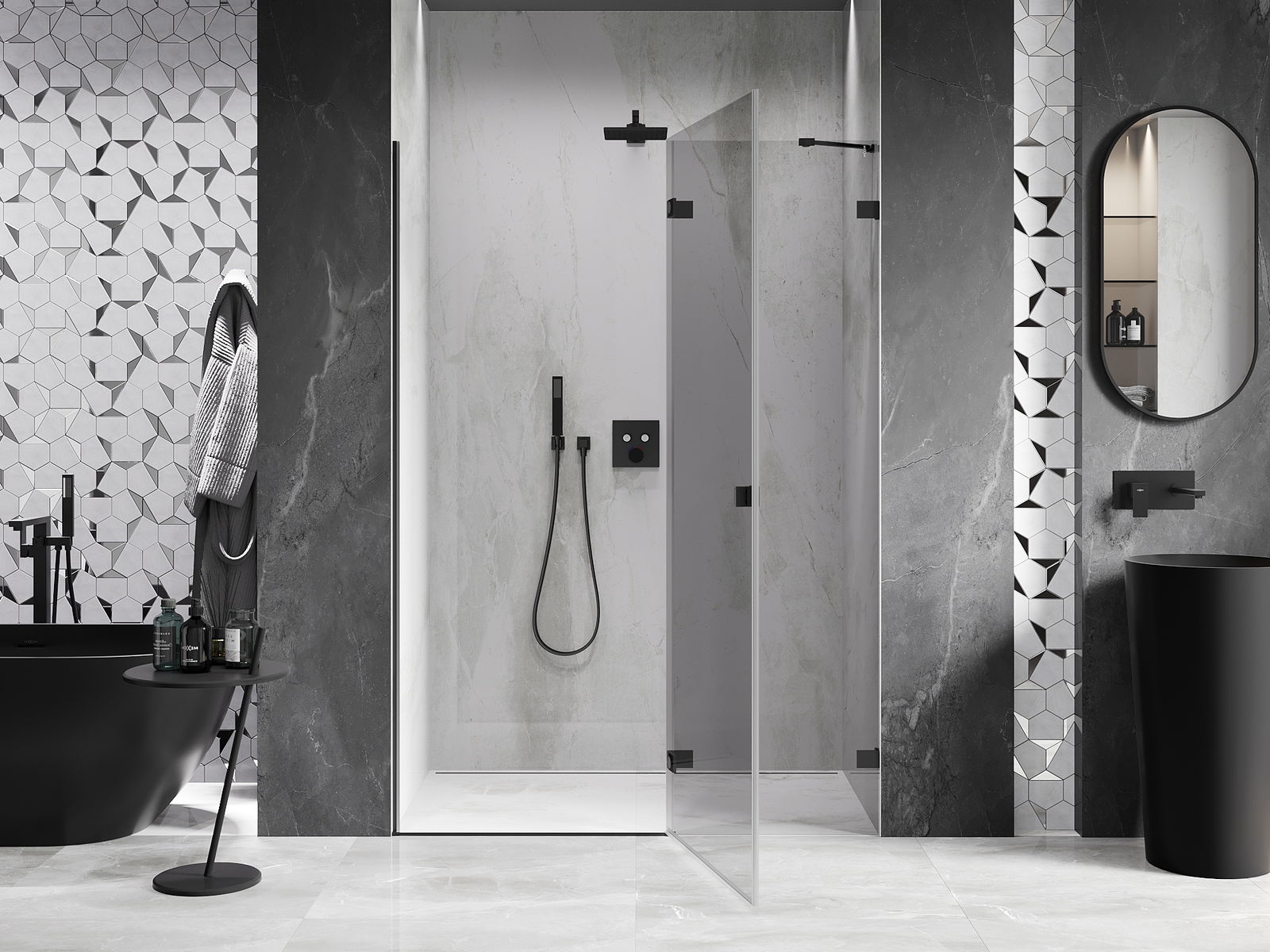Οι σφιγκτήρες και οι μεντεσέδες είναι κατασκευασμένοι από πολύ ανθεκτικό ορείχαλκο και επιπλέον δημιουργούν μια ευθυγραμμισμένη επιφάνεια γυαλιού. Είναι μια εξαιρετική επιλογή που συνδυάζει κομψότητα, ανθεκτικότητα και σύγχρονο σχεδιασμό. Χάρη σε αυτές τις λύσεις, η ντουζιέρα κερδίζει σε αισθητική και ταυτόχρονα διευκολύνουν τη διατήρηση της καθαριότητας.