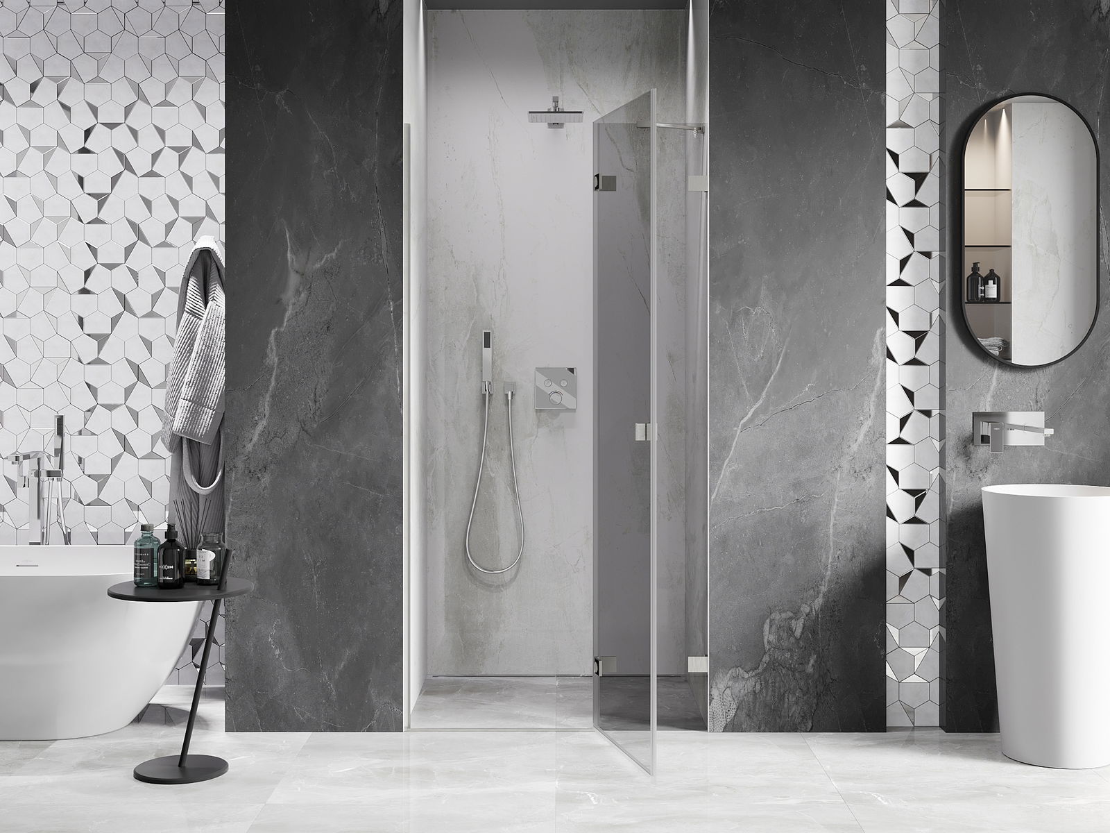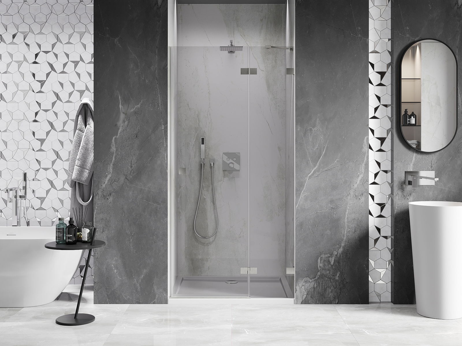Η πρακτική και άνετη λαβή κατασκευάζεται από ανθεκτικό και αντοχής μέταλλο. Ο μοντέρνος σχεδιασμός σε συνδυασμό με το φινίρισμα που ταιριάζει με το χρώμα των προφίλ προσδίδει στο σύνολο μια σύγχρονη και κομψή εμφάνιση, τονίζοντας την αισθητική κάθε μπάνιου.