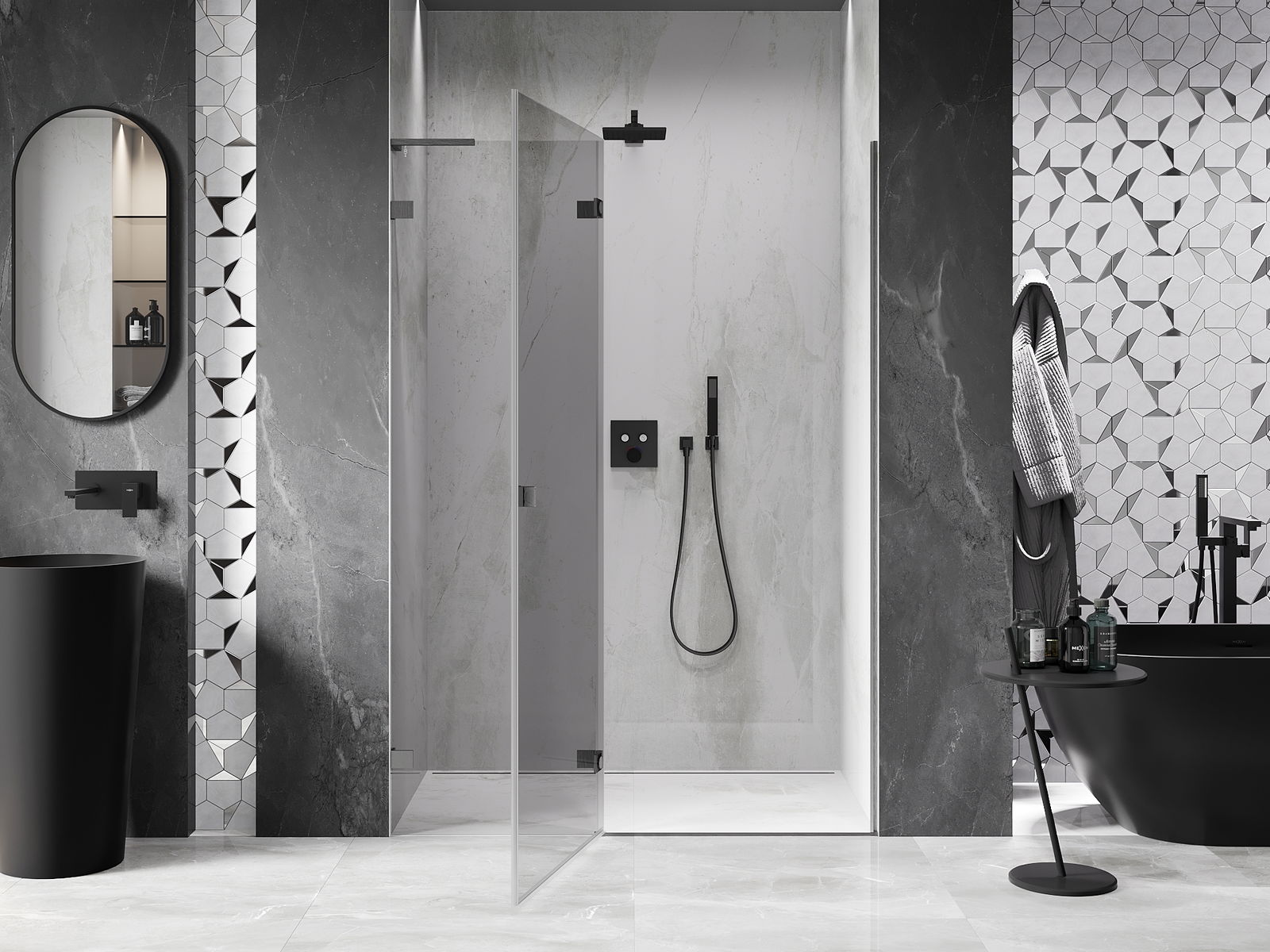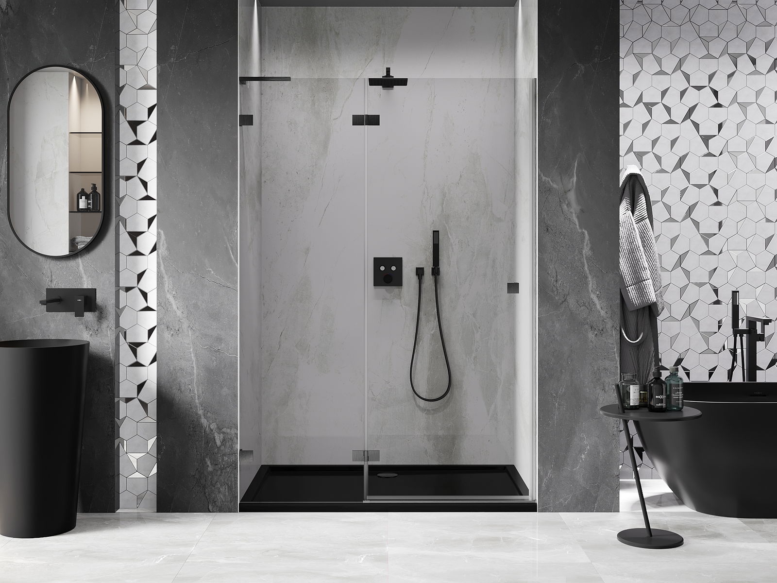 Οι σφιγκτήρες και οι μεντεσέδες είναι κατασκευασμένοι από πολύ ανθεκτικό ορείχαλκο και επιπλέον δημιουργούν μια ευθυγραμμισμένη επιφάνεια γυαλιού. Είναι μια εξαιρετική επιλογή που συνδυάζει κομψότητα, ανθεκτικότητα και σύγχρονο σχεδιασμό. Χάρη σε αυτές τις λύσεις, η ντουζιέρα κερδίζει σε αισθητική και ταυτόχρονα διευκολύνουν τη διατήρηση της καθαριότητας.