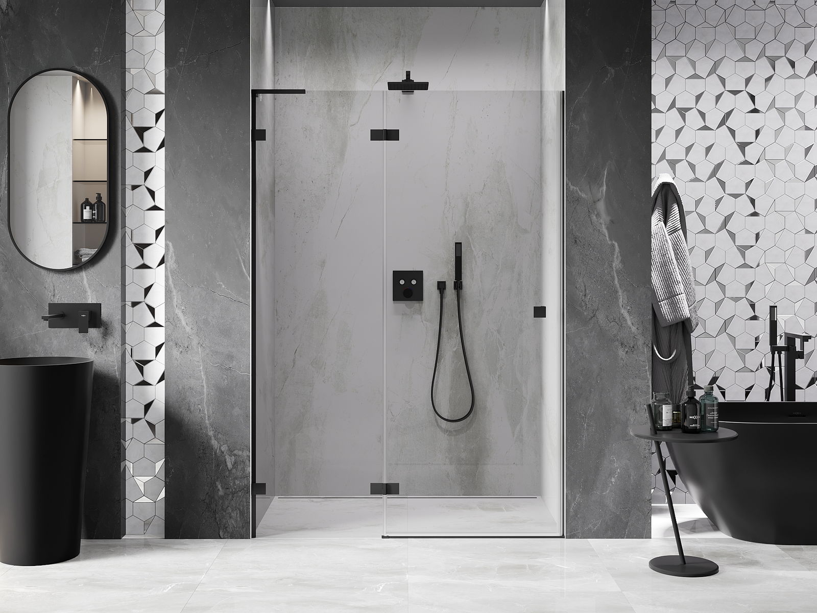 Οι σφιγκτήρες και οι μεντεσέδες είναι κατασκευασμένοι από πολύ ανθεκτικό ορείχαλκο και επιπλέον δημιουργούν μια ευθυγραμμισμένη επιφάνεια γυαλιού. Είναι μια εξαιρετική επιλογή που συνδυάζει κομψότητα, ανθεκτικότητα και σύγχρονο σχεδιασμό. Χάρη σε αυτές τις λύσεις, η ντουζιέρα κερδίζει σε αισθητική και ταυτόχρονα διευκολύνουν τη διατήρηση της καθαριότητας.