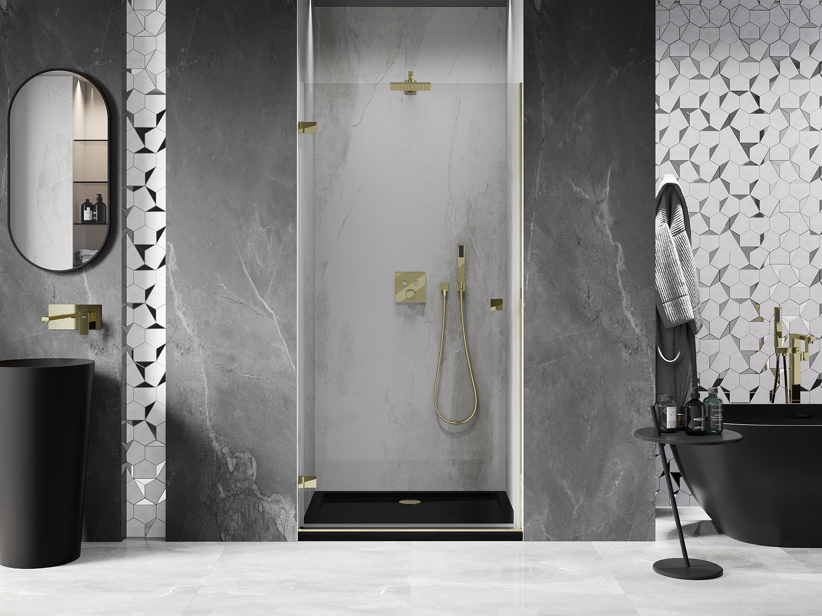 Η πρακτική και άνετη λαβή κατασκευάζεται από ανθεκτικό και αντοχής μέταλλο. Ο μοντέρνος σχεδιασμός σε συνδυασμό με το φινίρισμα που ταιριάζει με το χρώμα των προφίλ προσδίδει στο σύνολο μια σύγχρονη και κομψή εμφάνιση, τονίζοντας την αισθητική κάθε μπάνιου.