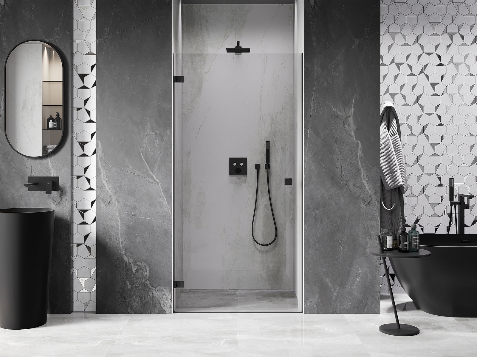 Η πρακτική και άνετη λαβή κατασκευάζεται από ανθεκτικό και αντοχής μέταλλο. Ο μοντέρνος σχεδιασμός σε συνδυασμό με το φινίρισμα που ταιριάζει με το χρώμα των προφίλ προσδίδει στο σύνολο μια σύγχρονη και κομψή εμφάνιση, τονίζοντας την αισθητική κάθε μπάνιου.