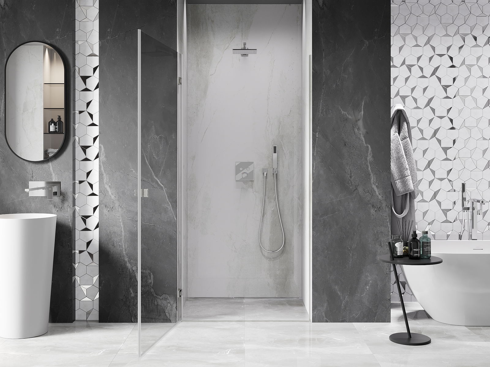 Η πρακτική και άνετη λαβή κατασκευάζεται από ανθεκτικό και αντοχής μέταλλο. Ο μοντέρνος σχεδιασμός σε συνδυασμό με το φινίρισμα που ταιριάζει με το χρώμα των προφίλ προσδίδει στο σύνολο μια σύγχρονη και κομψή εμφάνιση, τονίζοντας την αισθητική κάθε μπάνιου.