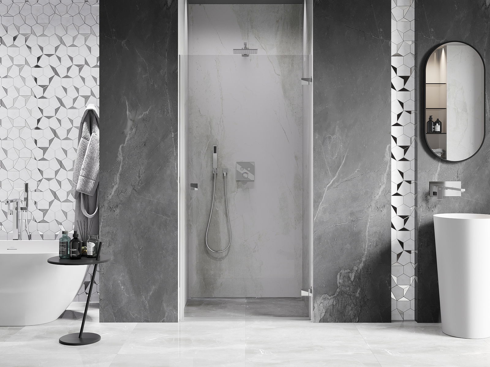 Η πρακτική και άνετη λαβή κατασκευάζεται από ανθεκτικό και αντοχής μέταλλο. Ο μοντέρνος σχεδιασμός σε συνδυασμό με το φινίρισμα που ταιριάζει με το χρώμα των προφίλ προσδίδει στο σύνολο μια σύγχρονη και κομψή εμφάνιση, τονίζοντας την αισθητική κάθε μπάνιου.