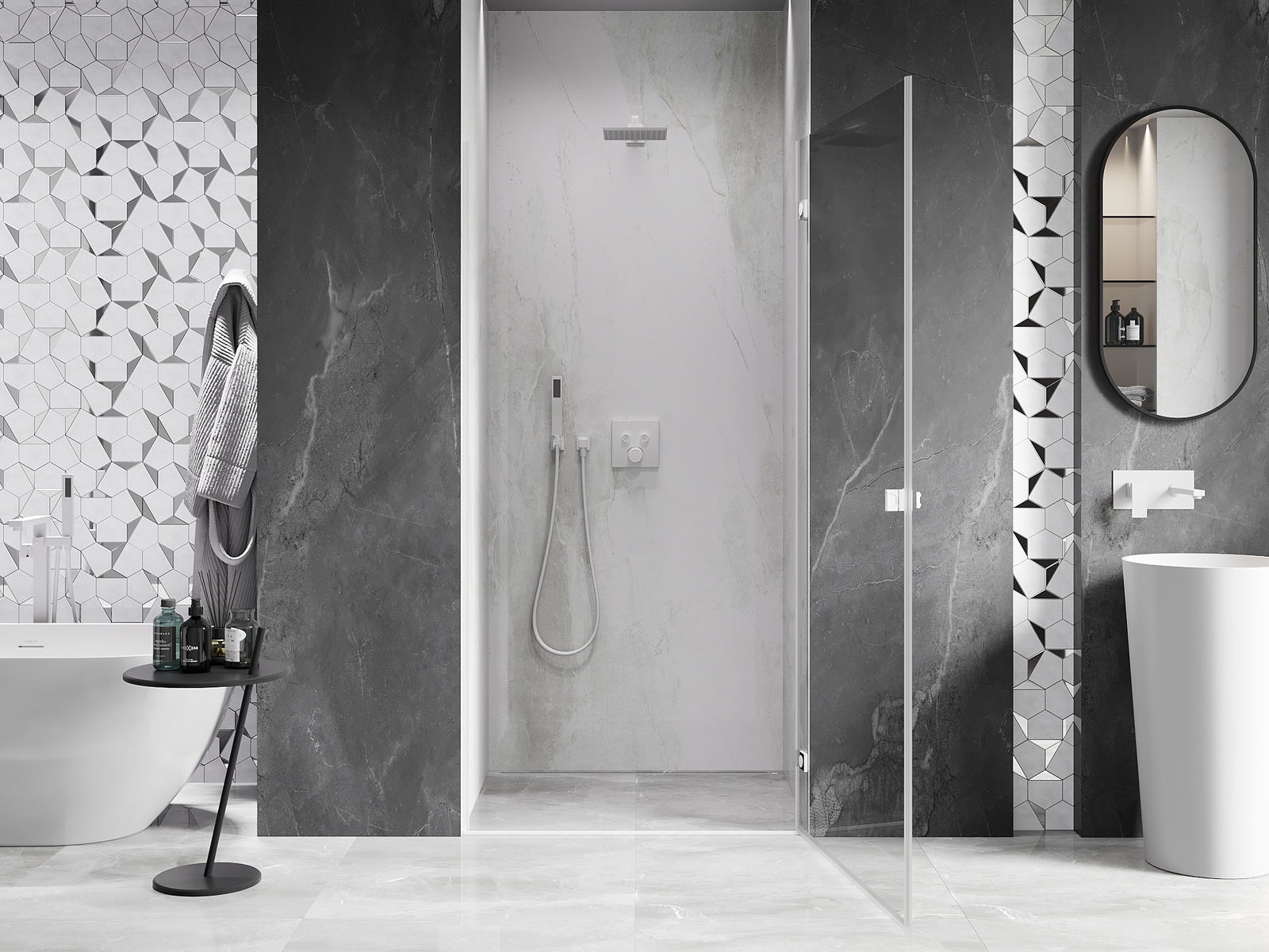 Η πρακτική και άνετη λαβή κατασκευάζεται από ανθεκτικό και αντοχής μέταλλο. Ο μοντέρνος σχεδιασμός σε συνδυασμό με το φινίρισμα που ταιριάζει με το χρώμα των προφίλ προσδίδει στο σύνολο μια σύγχρονη και κομψή εμφάνιση, τονίζοντας την αισθητική κάθε μπάνιου.