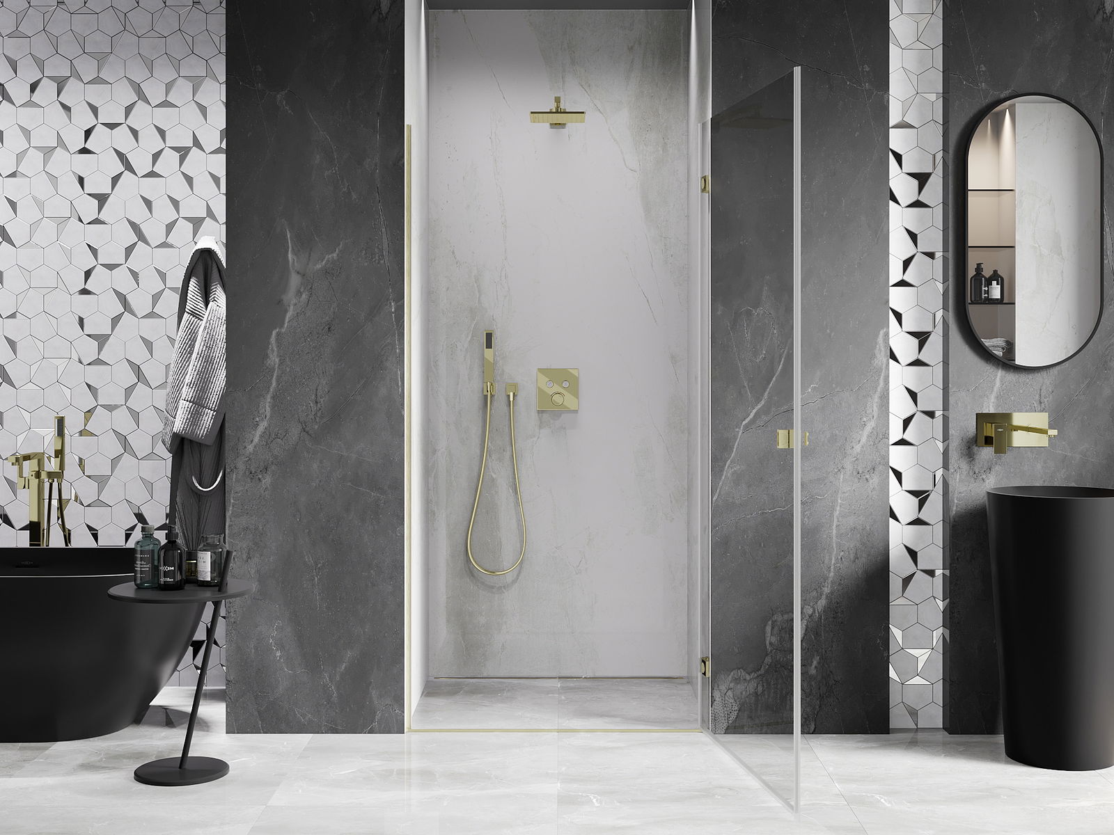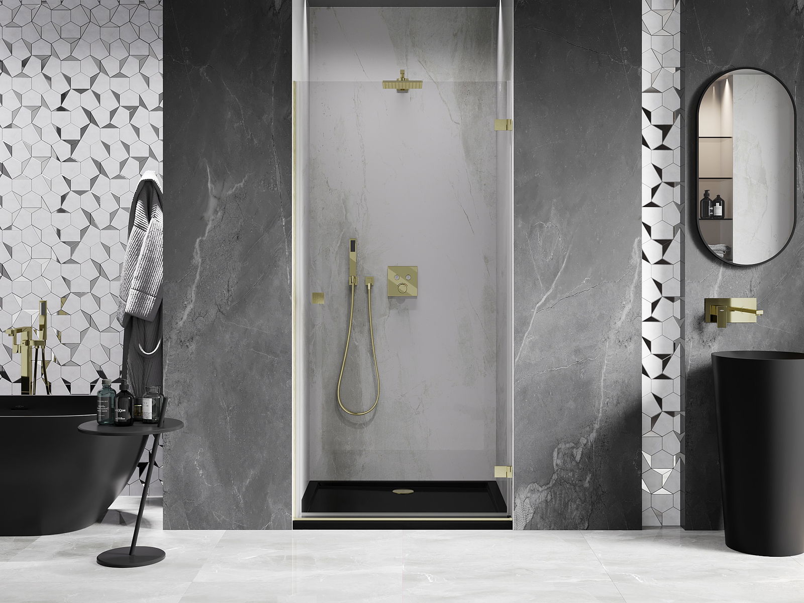 Η πρακτική και άνετη λαβή κατασκευάζεται από ανθεκτικό και αντοχής μέταλλο. Ο μοντέρνος σχεδιασμός σε συνδυασμό με το φινίρισμα που ταιριάζει με το χρώμα των προφίλ προσδίδει στο σύνολο μια σύγχρονη και κομψή εμφάνιση, τονίζοντας την αισθητική κάθε μπάνιου.