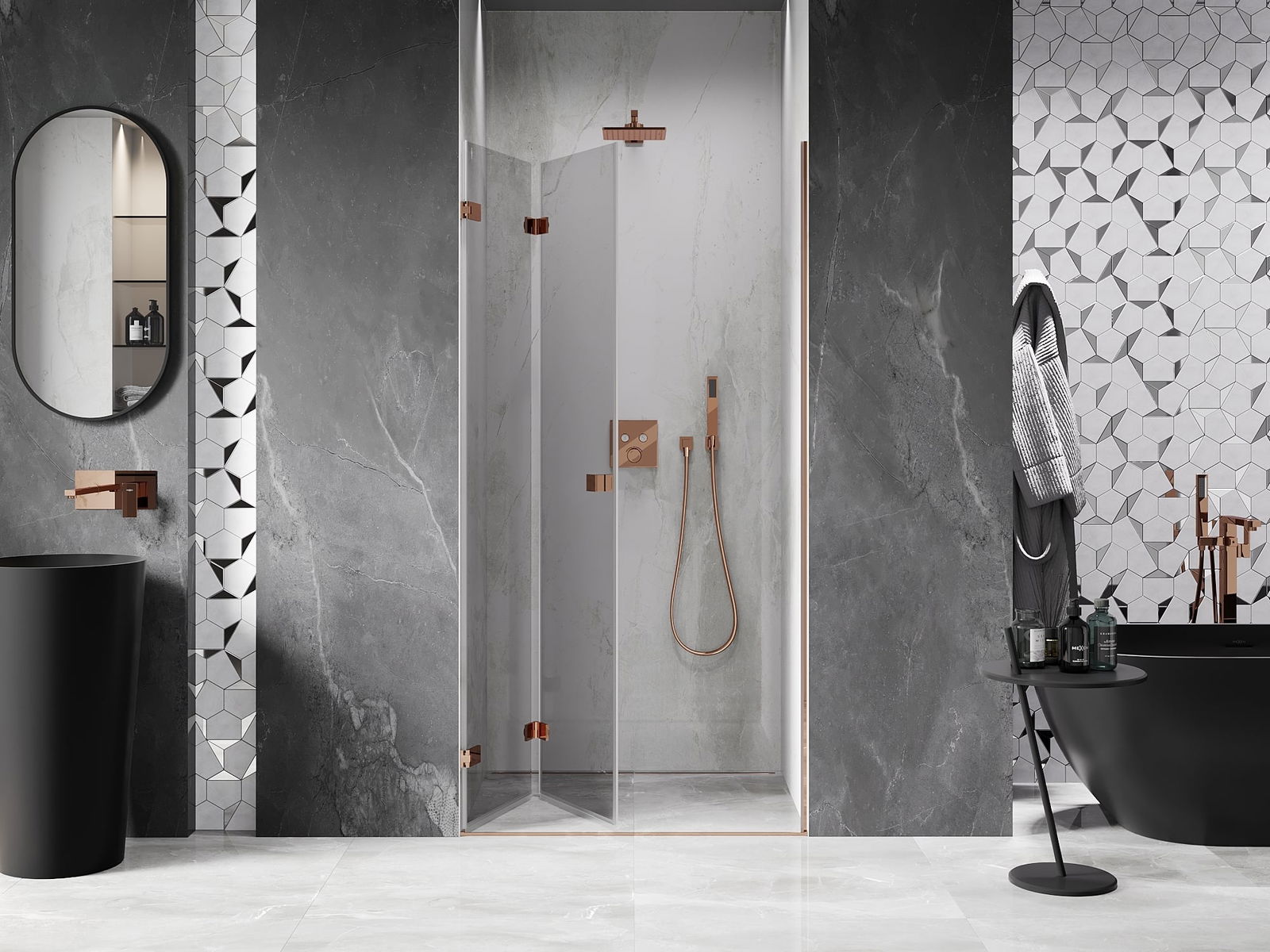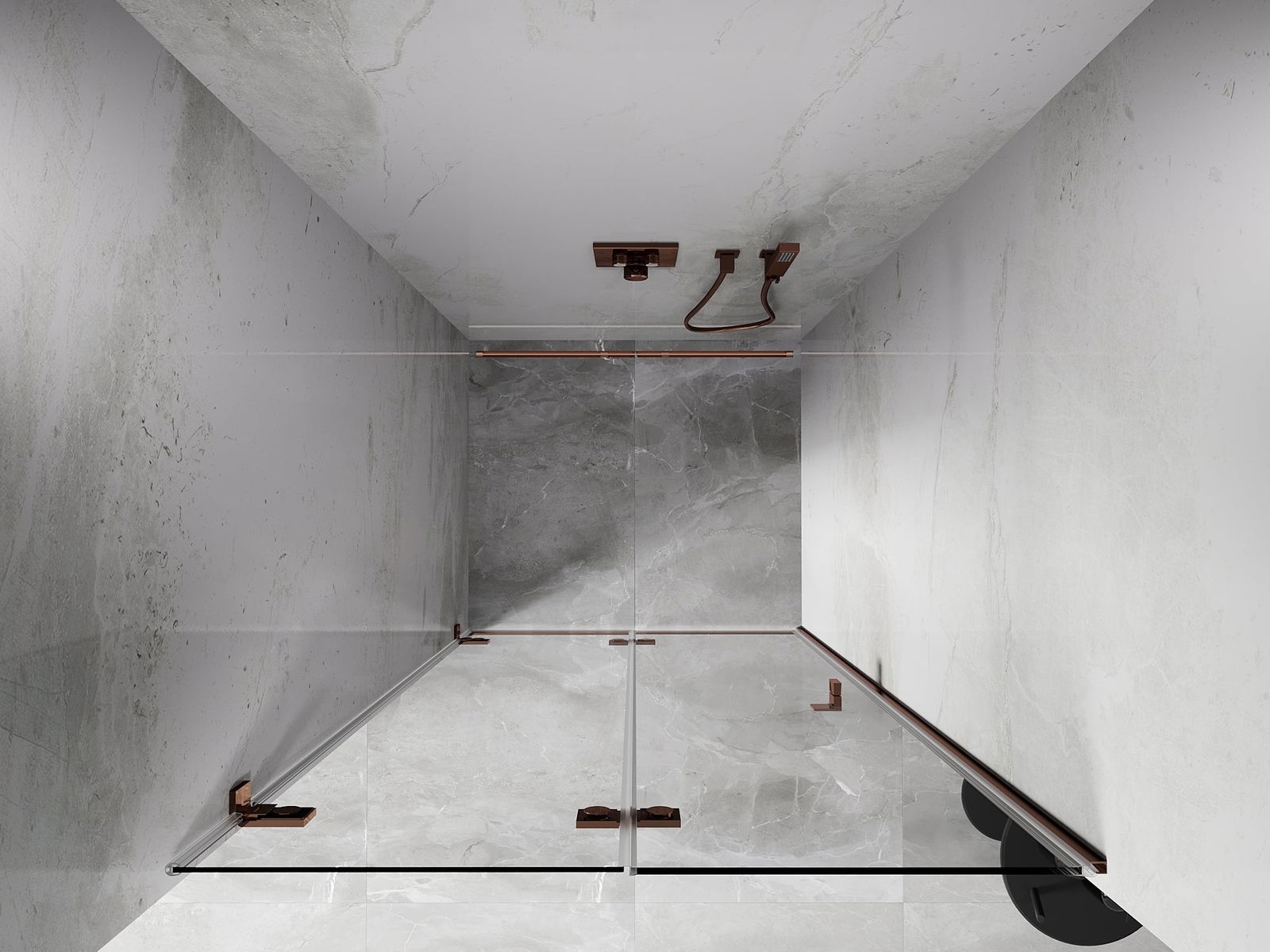 Οι σφιγκτήρες και οι μεντεσέδες είναι κατασκευασμένοι από πολύ ανθεκτικό ορείχαλκο και επιπλέον δημιουργούν μια ευθυγραμμισμένη επιφάνεια γυαλιού. Είναι μια εξαιρετική επιλογή που συνδυάζει κομψότητα, ανθεκτικότητα και σύγχρονο σχεδιασμό. Χάρη σε αυτές τις λύσεις, η ντουζιέρα κερδίζει σε αισθητική και ταυτόχρονα διευκολύνουν τη διατήρηση της καθαριότητας.