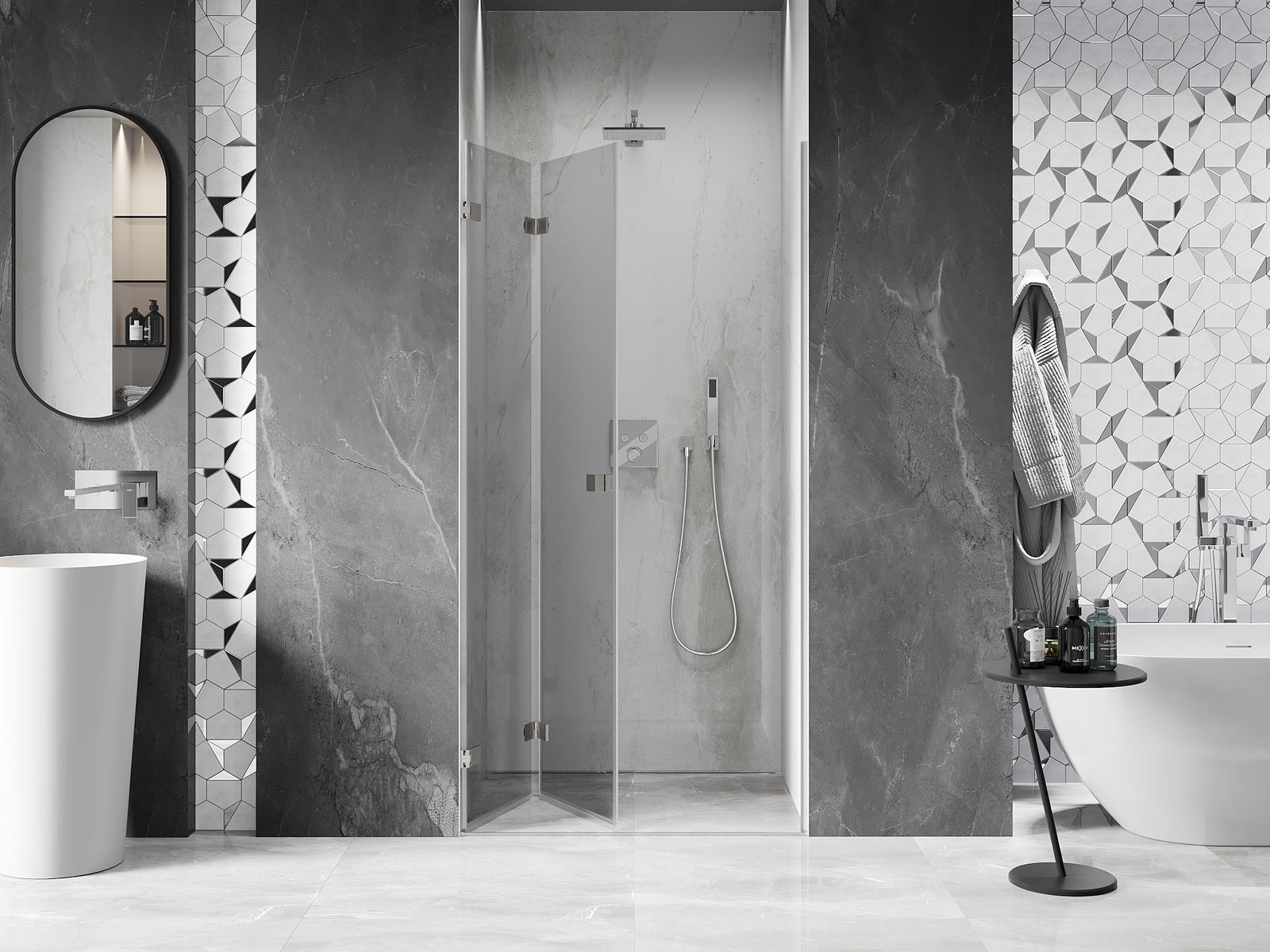Η δυνατότητα πτύχωσης των πορτών, τόσο προς τα έξω όσο και προς τα μέσα, επιτρέπει την απόκτηση περισσότερου χώρου όταν δεν χρησιμοποιείται το ντους. Αυτή είναι μια ιδανική λύση για μικρότερα μπάνια, αξιοποιώντας στο μέγιστο το διαθέσιμο χώρο.