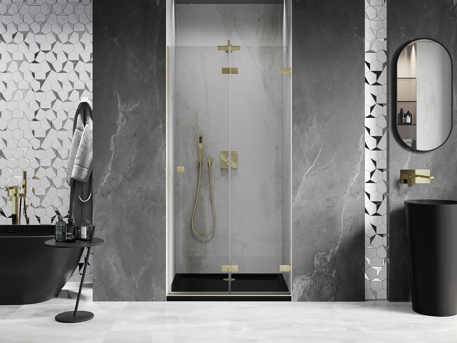 Οι σφιγκτήρες και οι μεντεσέδες είναι κατασκευασμένοι από πολύ ανθεκτικό ορείχαλκο και επιπλέον δημιουργούν μια ευθυγραμμισμένη επιφάνεια γυαλιού. Είναι μια εξαιρετική επιλογή που συνδυάζει κομψότητα, ανθεκτικότητα και σύγχρονο σχεδιασμό. Χάρη σε αυτές τις λύσεις, η ντουζιέρα κερδίζει σε αισθητική και ταυτόχρονα διευκολύνουν τη διατήρηση της καθαριότητας.