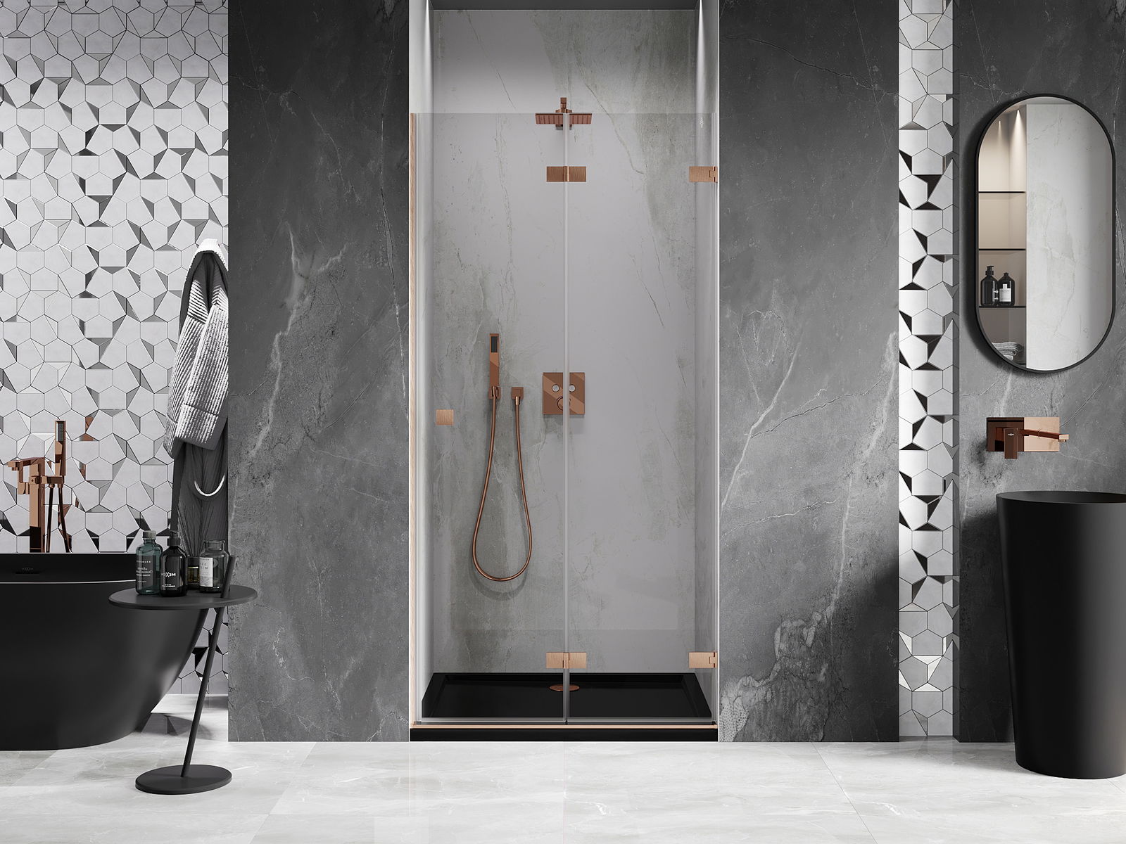 Οι σφιγκτήρες και οι μεντεσέδες είναι κατασκευασμένοι από πολύ ανθεκτικό ορείχαλκο και επιπλέον δημιουργούν μια ευθυγραμμισμένη επιφάνεια γυαλιού. Είναι μια εξαιρετική επιλογή που συνδυάζει κομψότητα, ανθεκτικότητα και σύγχρονο σχεδιασμό. Χάρη σε αυτές τις λύσεις, η ντουζιέρα κερδίζει σε αισθητική και ταυτόχρονα διευκολύνουν τη διατήρηση της καθαριότητας.