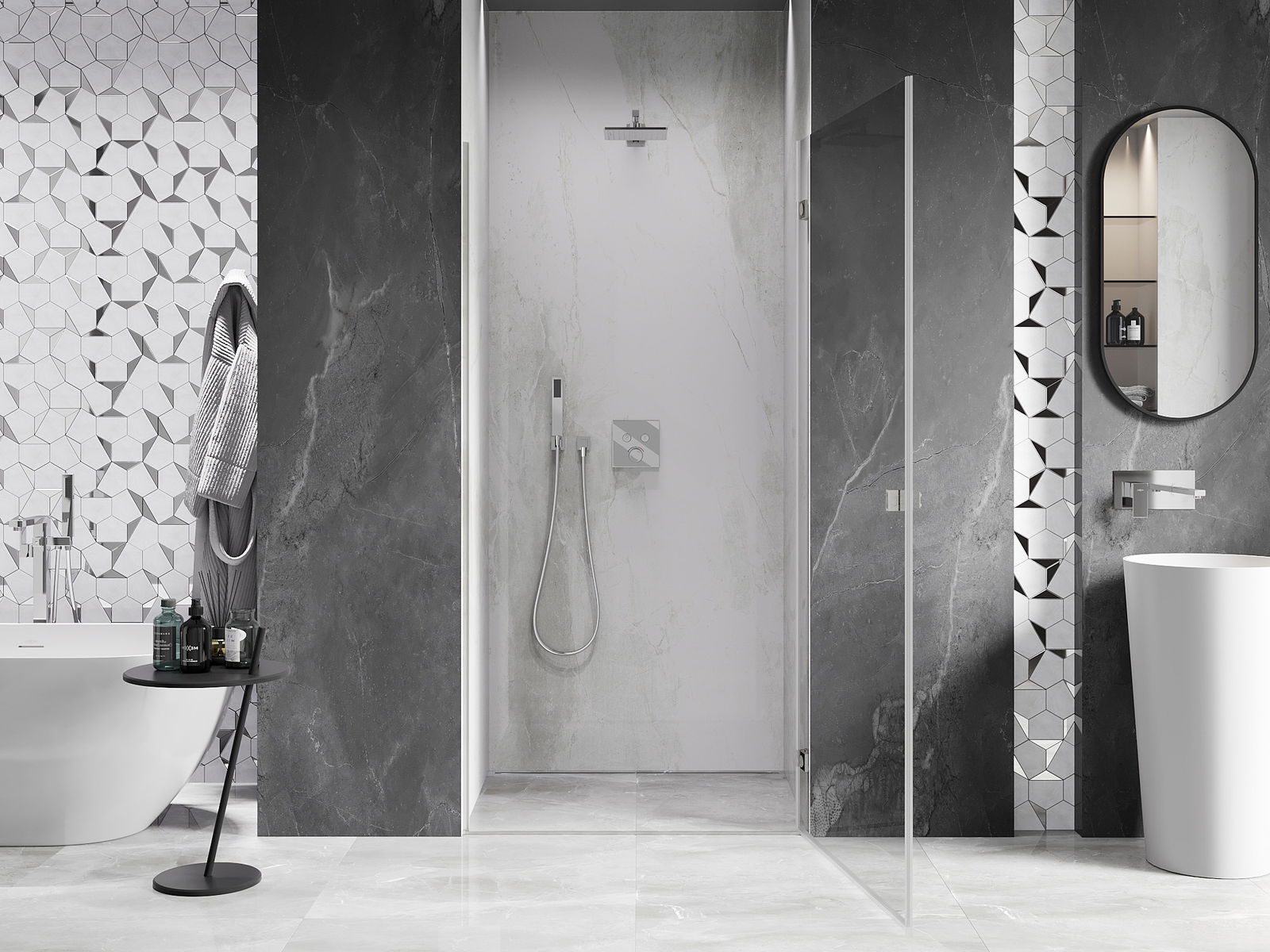 Η πρακτική και άνετη λαβή κατασκευάζεται από ανθεκτικό και αντοχής μέταλλο. Ο μοντέρνος σχεδιασμός σε συνδυασμό με το φινίρισμα που ταιριάζει με το χρώμα των προφίλ προσδίδει στο σύνολο μια σύγχρονη και κομψή εμφάνιση, τονίζοντας την αισθητική κάθε μπάνιου.