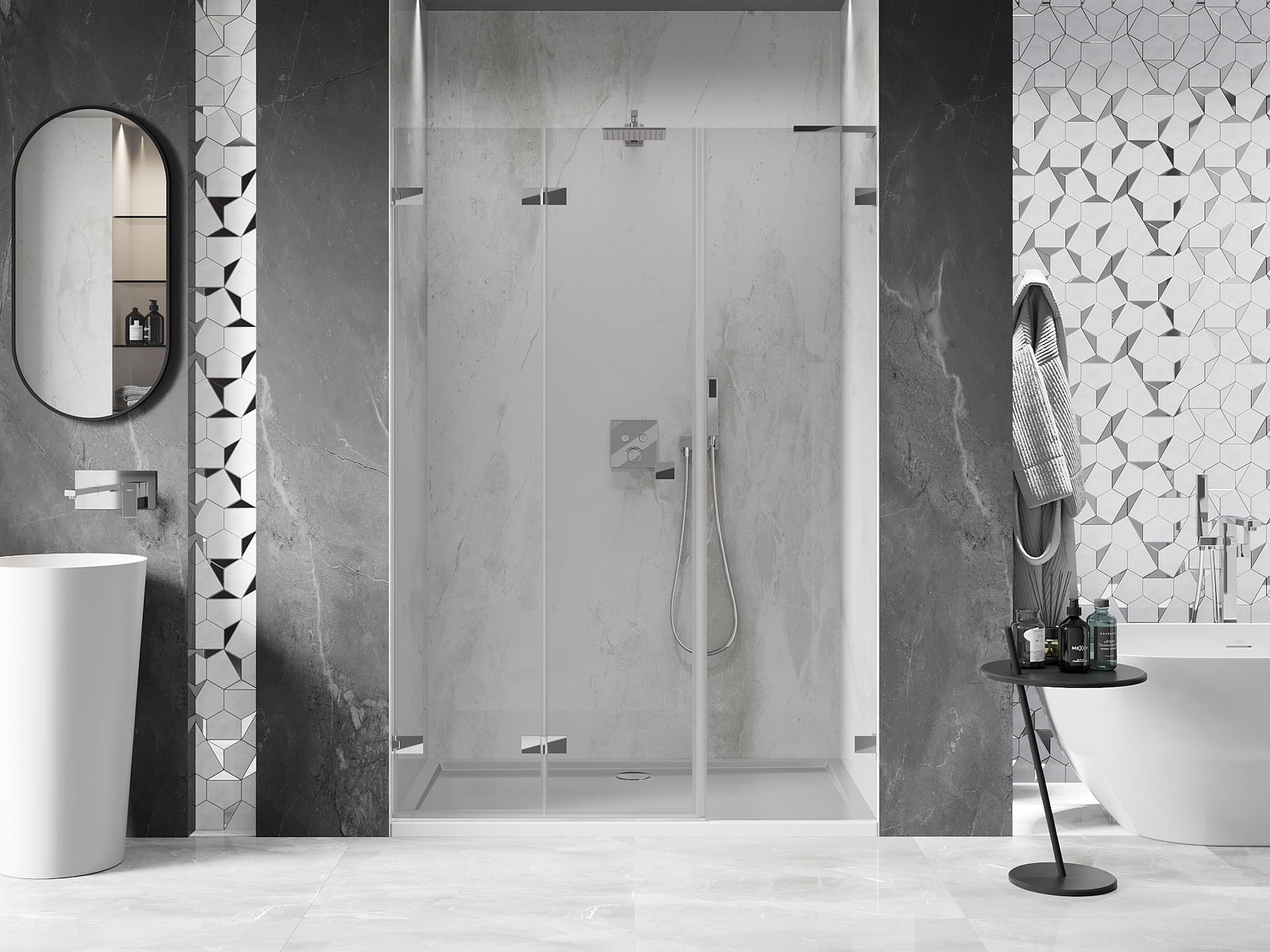 Η δυνατότητα πτύχωσης των πορτών, τόσο προς τα έξω όσο και προς τα μέσα, επιτρέπει την απόκτηση περισσότερου χώρου όταν δεν χρησιμοποιείται το ντους. Αυτή είναι μια ιδανική λύση για μικρότερα μπάνια, αξιοποιώντας στο μέγιστο το διαθέσιμο χώρο.