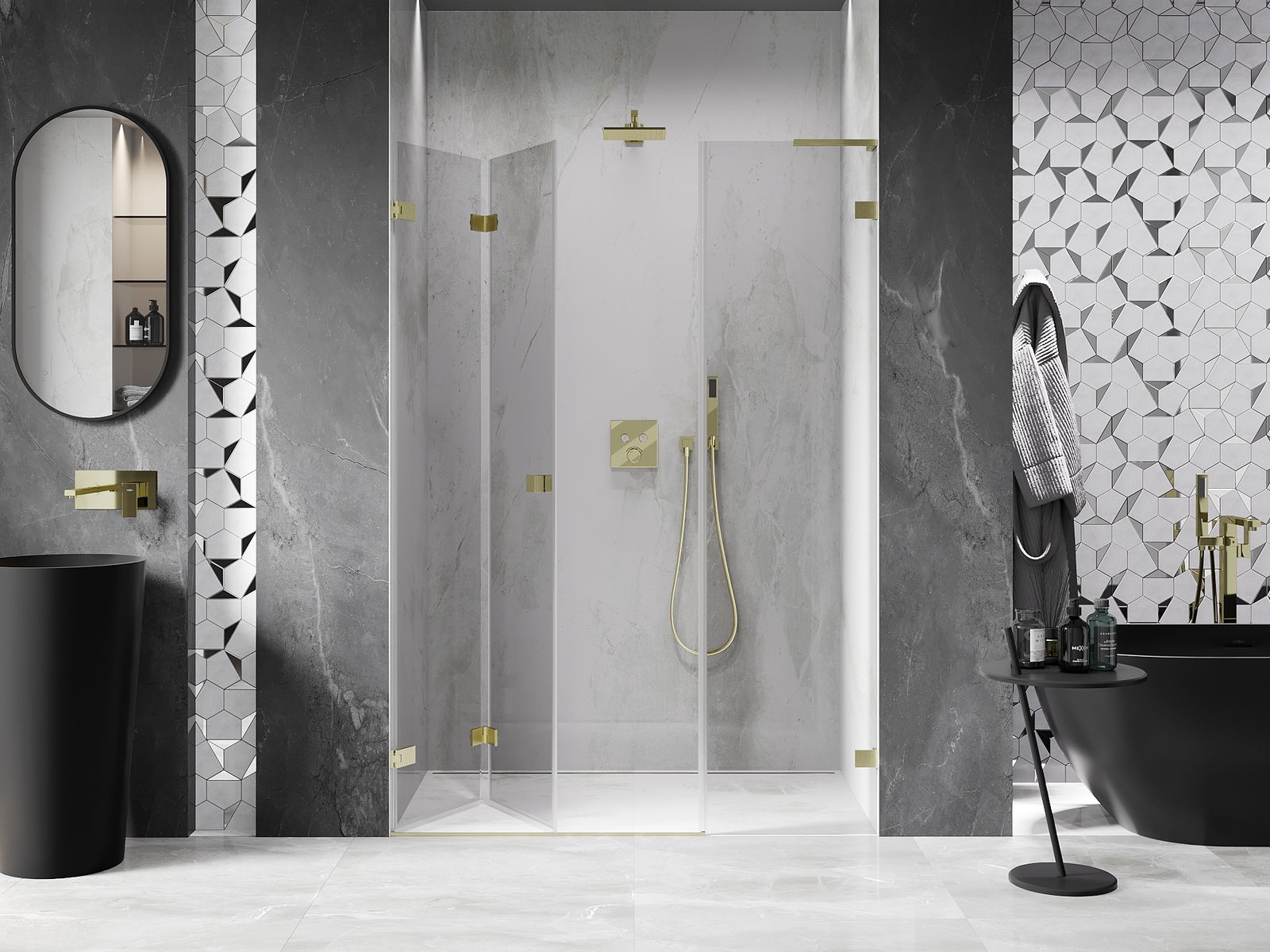 Οι σφιγκτήρες και οι μεντεσέδες είναι κατασκευασμένοι από πολύ ανθεκτικό ορείχαλκο και επιπλέον δημιουργούν μια ευθυγραμμισμένη επιφάνεια γυαλιού. Είναι μια εξαιρετική επιλογή που συνδυάζει κομψότητα, ανθεκτικότητα και σύγχρονο σχεδιασμό. Χάρη σε αυτές τις λύσεις, η ντουζιέρα κερδίζει σε αισθητική και ταυτόχρονα διευκολύνουν τη διατήρηση της καθαριότητας.