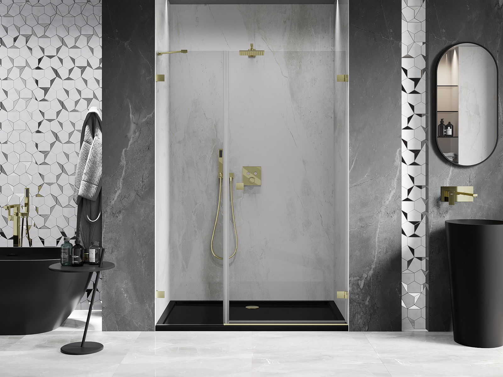 Η πρακτική και άνετη λαβή κατασκευάζεται από ανθεκτικό και αντοχής μέταλλο. Ο μοντέρνος σχεδιασμός σε συνδυασμό με το φινίρισμα που ταιριάζει με το χρώμα των προφίλ προσδίδει στο σύνολο μια σύγχρονη και κομψή εμφάνιση, τονίζοντας την αισθητική κάθε μπάνιου.