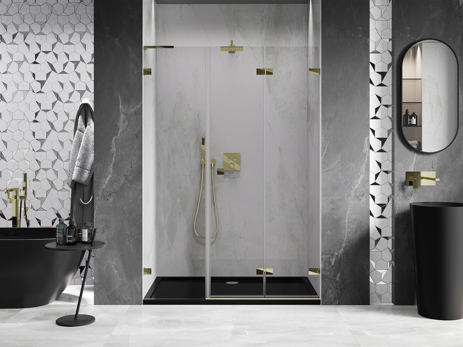 Οι σφιγκτήρες και οι μεντεσέδες είναι κατασκευασμένοι από πολύ ανθεκτικό ορείχαλκο και επιπλέον δημιουργούν μια ευθυγραμμισμένη επιφάνεια γυαλιού. Είναι μια εξαιρετική επιλογή που συνδυάζει κομψότητα, ανθεκτικότητα και σύγχρονο σχεδιασμό. Χάρη σε αυτές τις λύσεις, η ντουζιέρα κερδίζει σε αισθητική και ταυτόχρονα διευκολύνουν τη διατήρηση της καθαριότητας.