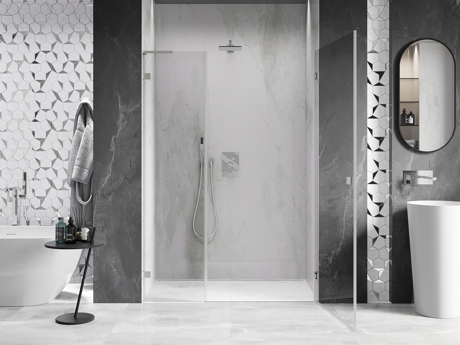 Η πρακτική και άνετη λαβή κατασκευάζεται από ανθεκτικό και αντοχής μέταλλο. Ο μοντέρνος σχεδιασμός σε συνδυασμό με το φινίρισμα που ταιριάζει με το χρώμα των προφίλ προσδίδει στο σύνολο μια σύγχρονη και κομψή εμφάνιση, τονίζοντας την αισθητική κάθε μπάνιου.