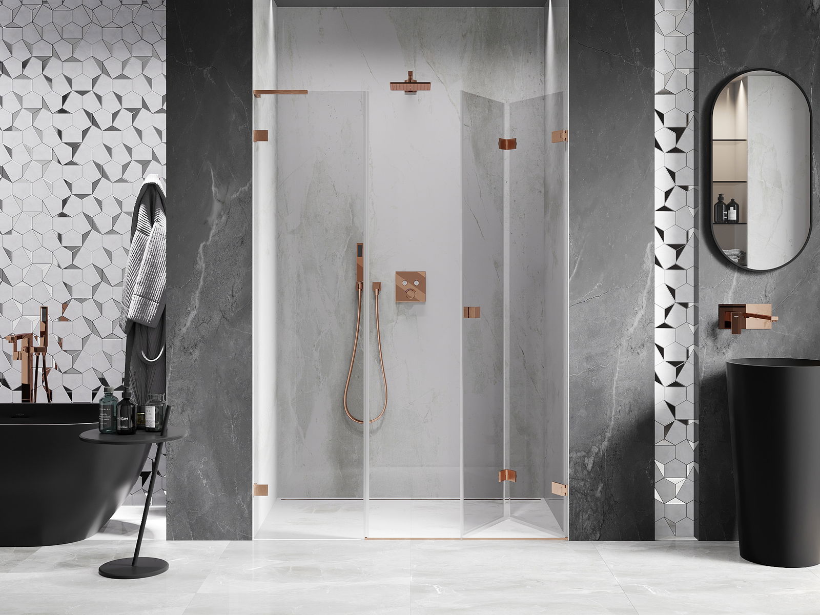 Οι σφιγκτήρες και οι μεντεσέδες είναι κατασκευασμένοι από πολύ ανθεκτικό ορείχαλκο και επιπλέον δημιουργούν μια ευθυγραμμισμένη επιφάνεια γυαλιού. Είναι μια εξαιρετική επιλογή που συνδυάζει κομψότητα, ανθεκτικότητα και σύγχρονο σχεδιασμό. Χάρη σε αυτές τις λύσεις, η ντουζιέρα κερδίζει σε αισθητική και ταυτόχρονα διευκολύνουν τη διατήρηση της καθαριότητας.