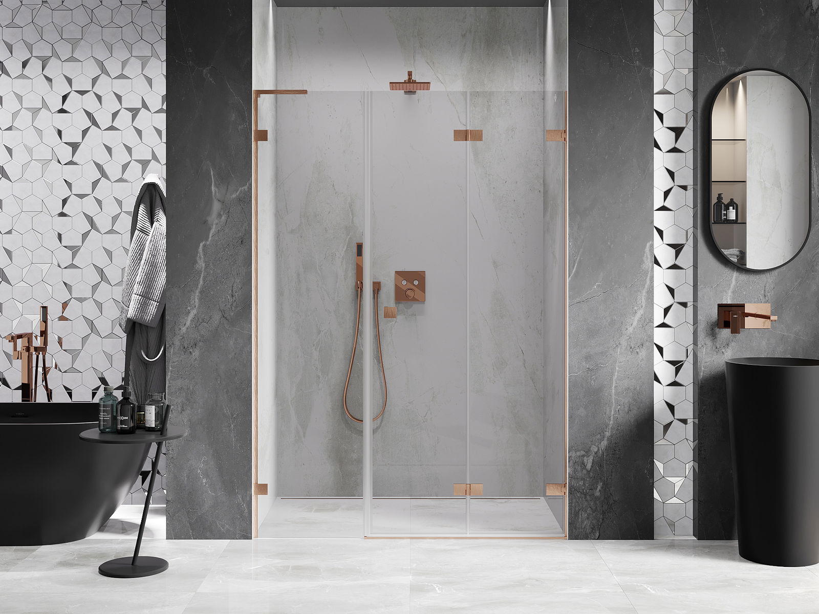 Οι σφιγκτήρες και οι μεντεσέδες είναι κατασκευασμένοι από πολύ ανθεκτικό ορείχαλκο και επιπλέον δημιουργούν μια ευθυγραμμισμένη επιφάνεια γυαλιού. Είναι μια εξαιρετική επιλογή που συνδυάζει κομψότητα, ανθεκτικότητα και σύγχρονο σχεδιασμό. Χάρη σε αυτές τις λύσεις, η ντουζιέρα κερδίζει σε αισθητική και ταυτόχρονα διευκολύνουν τη διατήρηση της καθαριότητας.
