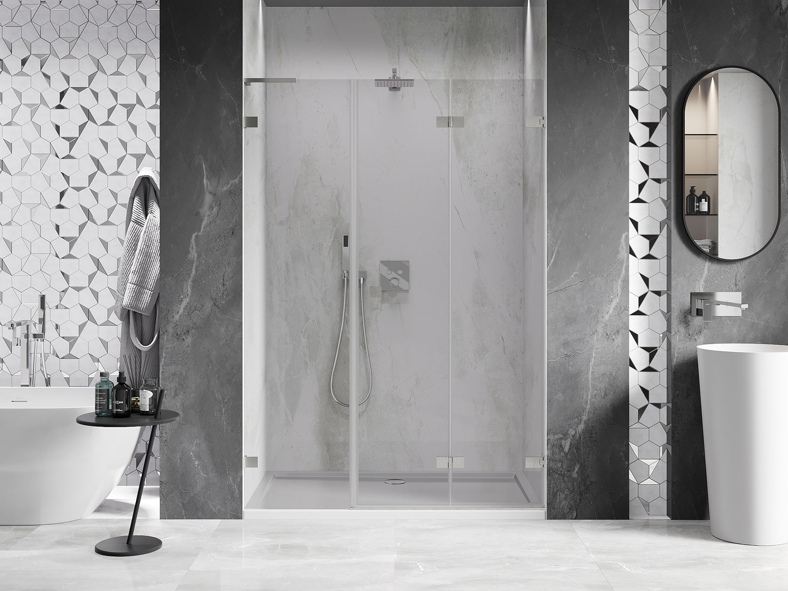Η δυνατότητα πτύχωσης των πορτών, τόσο προς τα έξω όσο και προς τα μέσα, επιτρέπει την απόκτηση περισσότερου χώρου όταν δεν χρησιμοποιείται το ντους. Αυτή είναι μια ιδανική λύση για μικρότερα μπάνια, αξιοποιώντας στο μέγιστο το διαθέσιμο χώρο.