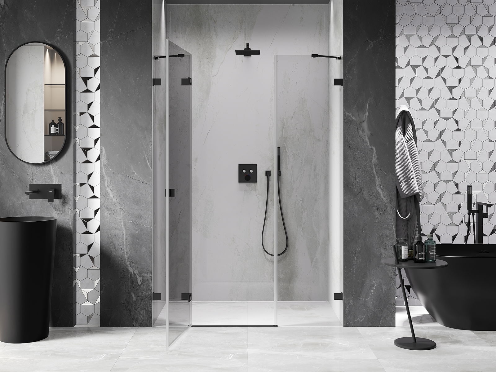Οι σφιγκτήρες και οι μεντεσέδες είναι κατασκευασμένοι από πολύ ανθεκτικό ορείχαλκο και επιπλέον δημιουργούν μια ευθυγραμμισμένη επιφάνεια γυαλιού. Είναι μια εξαιρετική επιλογή που συνδυάζει κομψότητα, ανθεκτικότητα και σύγχρονο σχεδιασμό. Χάρη σε αυτές τις λύσεις, η ντουζιέρα κερδίζει σε αισθητική και ταυτόχρονα διευκολύνουν τη διατήρηση της καθαριότητας.