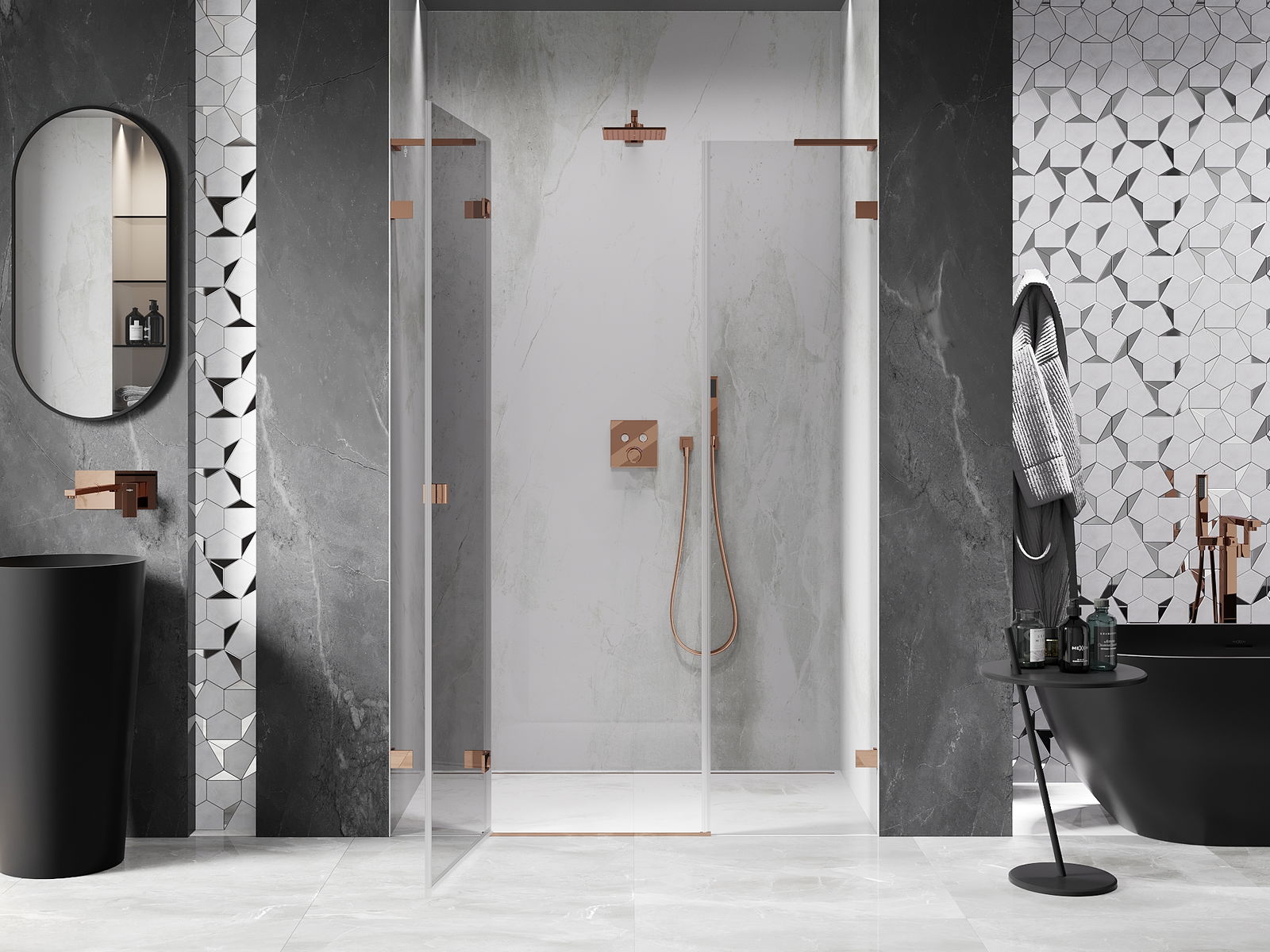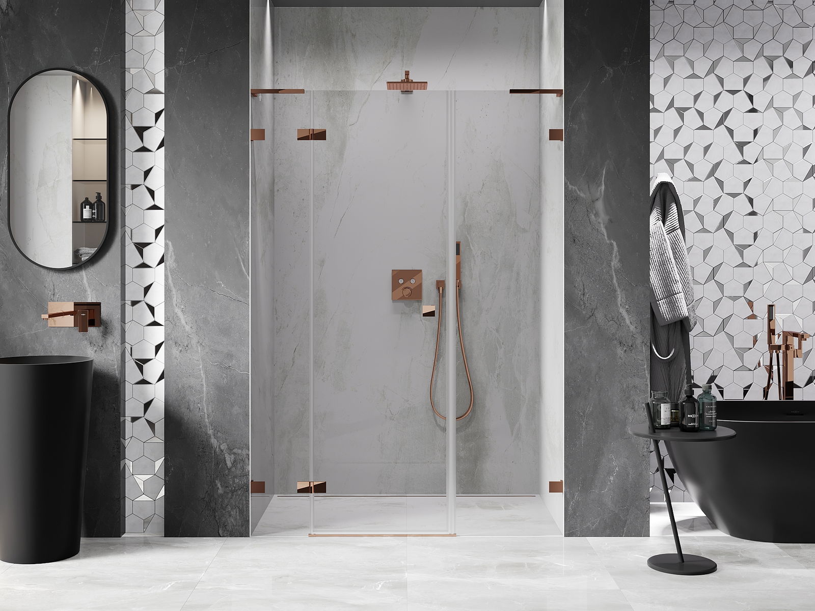 Οι σφιγκτήρες και οι μεντεσέδες είναι κατασκευασμένοι από πολύ ανθεκτικό ορείχαλκο και επιπλέον δημιουργούν μια ευθυγραμμισμένη επιφάνεια γυαλιού. Είναι μια εξαιρετική επιλογή που συνδυάζει κομψότητα, ανθεκτικότητα και σύγχρονο σχεδιασμό. Χάρη σε αυτές τις λύσεις, η ντουζιέρα κερδίζει σε αισθητική και ταυτόχρονα διευκολύνουν τη διατήρηση της καθαριότητας.