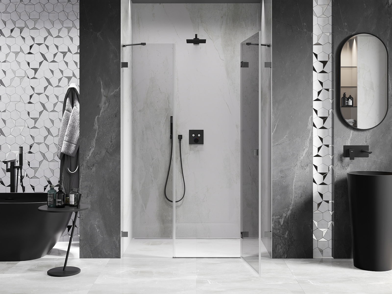 Οι σφιγκτήρες και οι μεντεσέδες είναι κατασκευασμένοι από πολύ ανθεκτικό ορείχαλκο και επιπλέον δημιουργούν μια ευθυγραμμισμένη επιφάνεια γυαλιού. Είναι μια εξαιρετική επιλογή που συνδυάζει κομψότητα, ανθεκτικότητα και σύγχρονο σχεδιασμό. Χάρη σε αυτές τις λύσεις, η ντουζιέρα κερδίζει σε αισθητική και ταυτόχρονα διευκολύνουν τη διατήρηση της καθαριότητας.