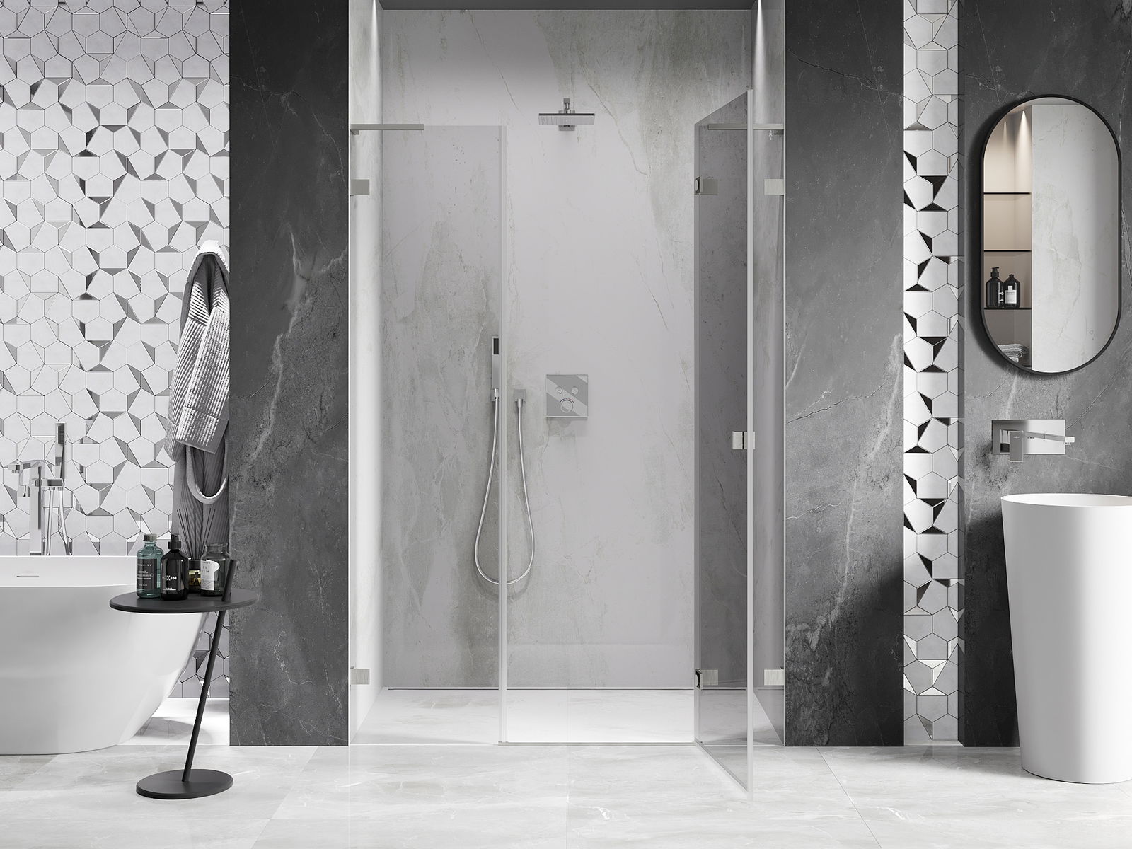 Η πρακτική και άνετη λαβή κατασκευάζεται από ανθεκτικό και αντοχής μέταλλο. Ο μοντέρνος σχεδιασμός σε συνδυασμό με το φινίρισμα που ταιριάζει με το χρώμα των προφίλ προσδίδει στο σύνολο μια σύγχρονη και κομψή εμφάνιση, τονίζοντας την αισθητική κάθε μπάνιου.