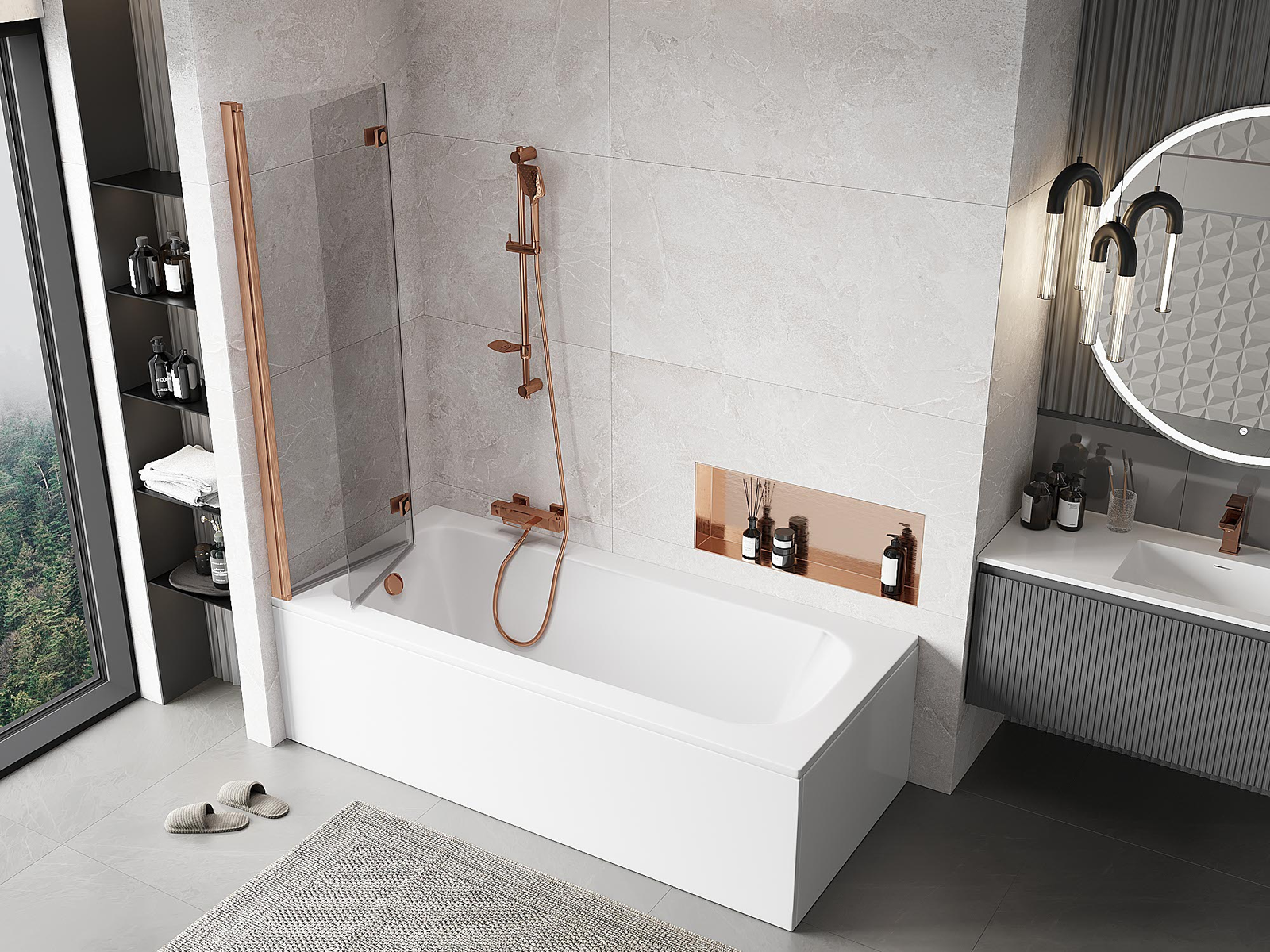 Ο διαχωριστικό κατασκευασμένο από δύο φτερά με δυνατότητα αναδίπλωσης. Αυτή η λύση επιτρέπει την εξοικονόμηση περισσότερου χώρου στο μπάνιο και παρέχει τη δυνατότητα ελεύθερης χρήσης του υπόλοιπου χώρου όταν δεν χρησιμοποιούμε την περιοχή κολύμβησης.