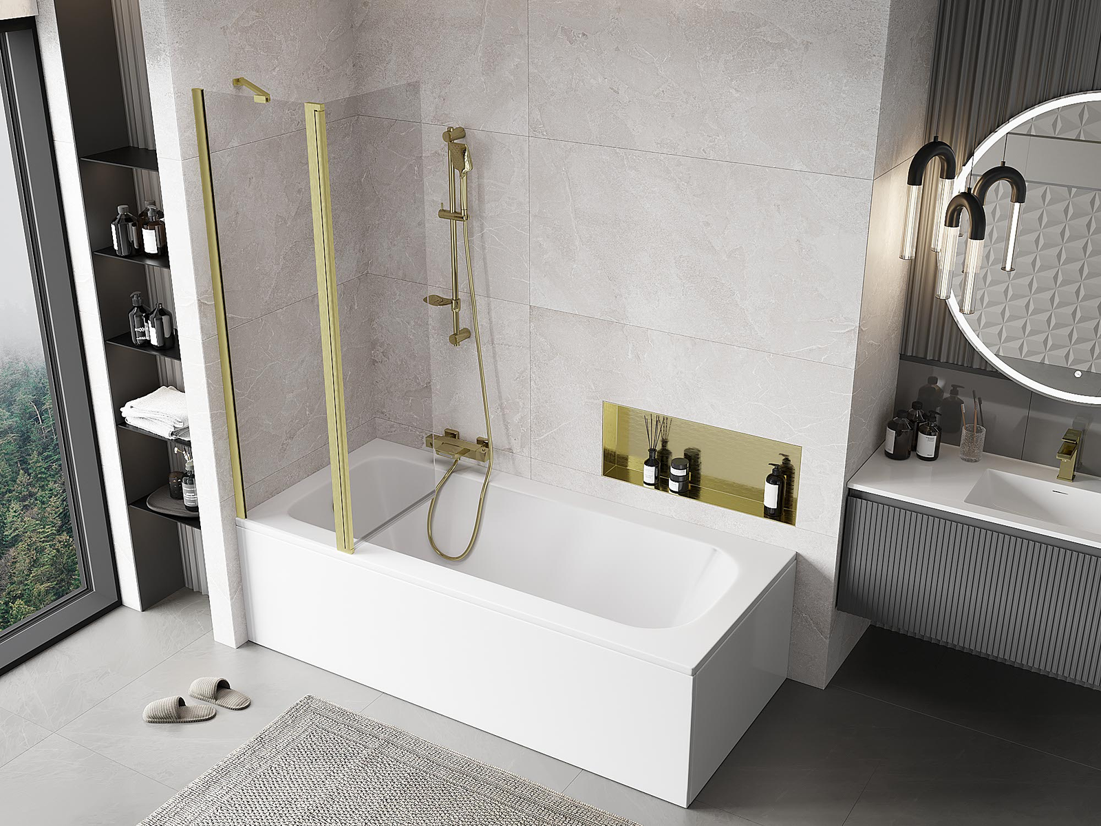Ο διαχωριστικό κατασκευασμένο από δύο φτερά με δυνατότητα αναδίπλωσης. Αυτή η λύση επιτρέπει την εξοικονόμηση περισσότερου χώρου στο μπάνιο και παρέχει τη δυνατότητα ελεύθερης χρήσης του υπόλοιπου χώρου όταν δεν χρησιμοποιούμε την περιοχή κολύμβησης.