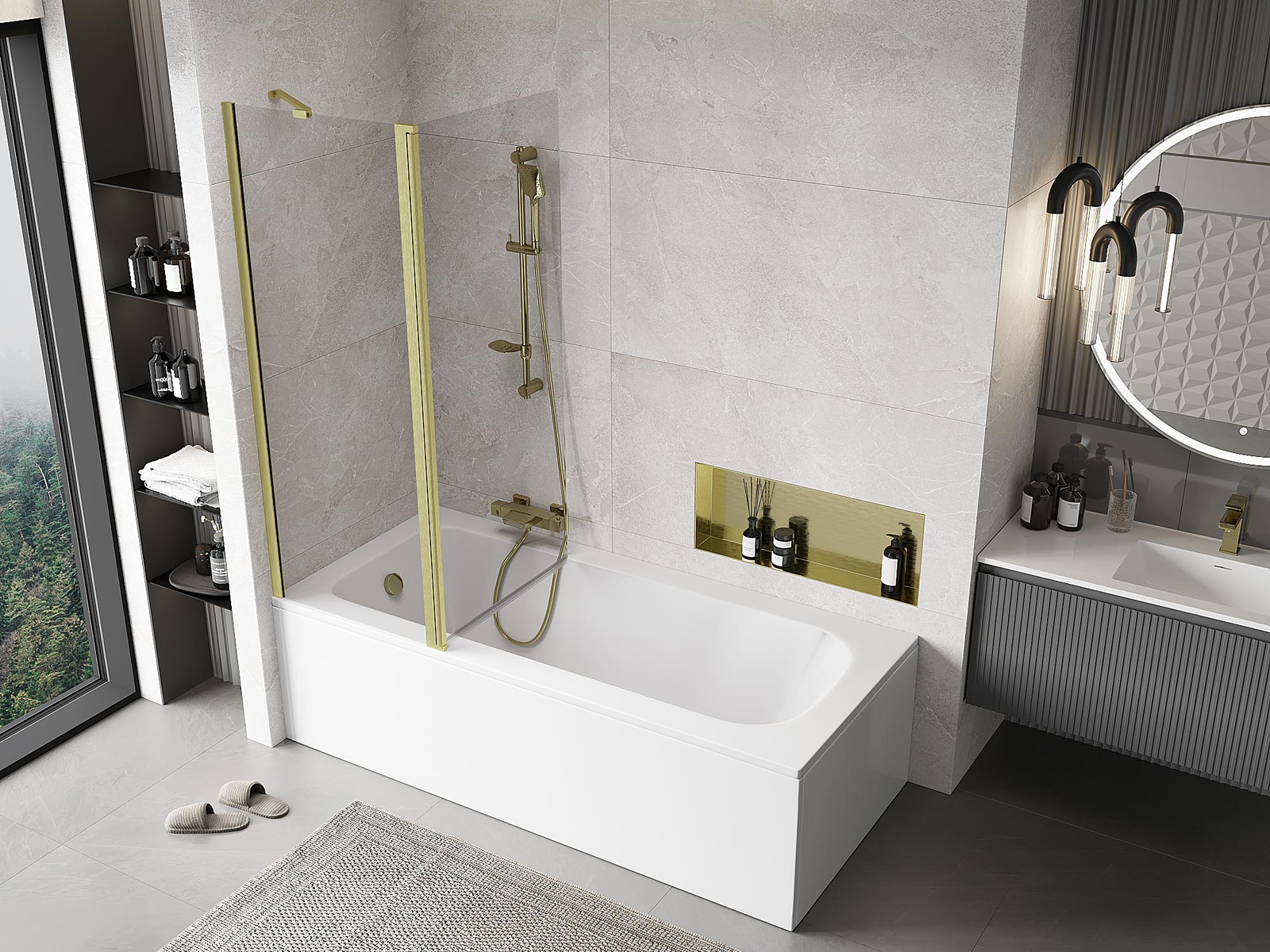 Ο διαχωριστικό κατασκευασμένο από δύο φτερά με δυνατότητα αναδίπλωσης. Αυτή η λύση επιτρέπει την εξοικονόμηση περισσότερου χώρου στο μπάνιο και παρέχει τη δυνατότητα ελεύθερης χρήσης του υπόλοιπου χώρου όταν δεν χρησιμοποιούμε την περιοχή κολύμβησης.