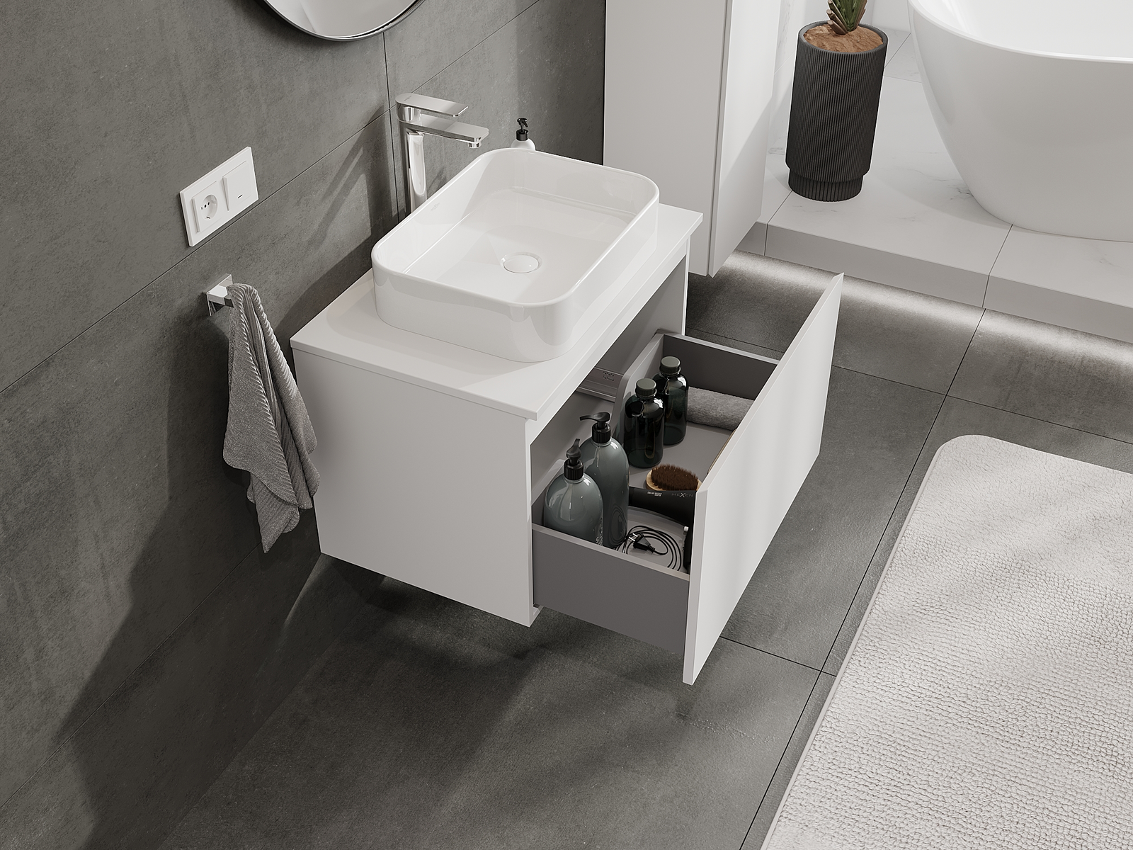 Η εγκοπή στο συρτάρι είναι σχεδιασμένη με τέτοιο τρόπο, ώστε να φιλοξενεί το σιφόνι, το οποίο είναι απαραίτητο στις εγκαταστάσεις νιπτήρων. Έτσι, το έπιπλο μπορεί να εγκατασταθεί πλήρως λειτουργικά, χωρίς την ανάγκη παραίτησης από χώρο στο συρτάρι υπέρ της εγκατάστασης.