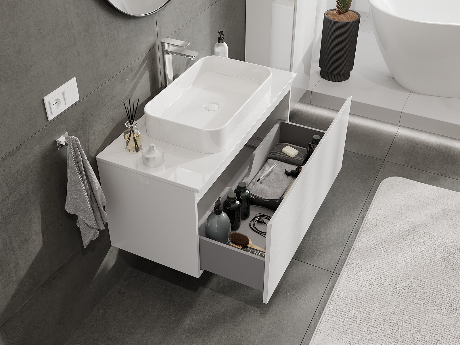 Η εγκοπή στο συρτάρι είναι σχεδιασμένη με τέτοιο τρόπο, ώστε να φιλοξενεί το σιφόνι, το οποίο είναι απαραίτητο στις εγκαταστάσεις νιπτήρων. Έτσι, το έπιπλο μπορεί να εγκατασταθεί πλήρως λειτουργικά, χωρίς την ανάγκη παραίτησης από χώρο στο συρτάρι υπέρ της εγκατάστασης.