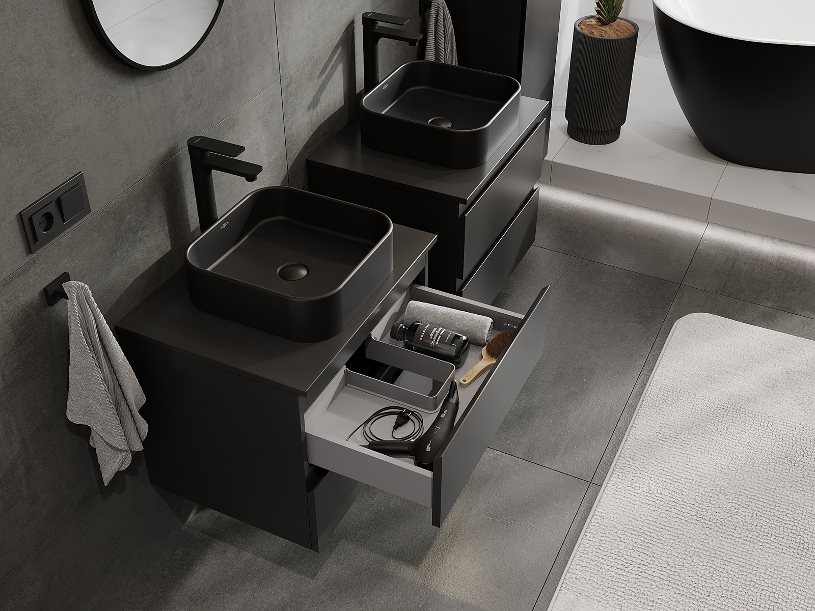 Η εγκοπή στο συρτάρι είναι σχεδιασμένη με τέτοιο τρόπο, ώστε να φιλοξενεί το σιφόνι, το οποίο είναι απαραίτητο στις εγκαταστάσεις νιπτήρων. Έτσι, το έπιπλο μπορεί να εγκατασταθεί πλήρως λειτουργικά, χωρίς την ανάγκη παραίτησης από χώρο στο συρτάρι υπέρ της εγκατάστασης.