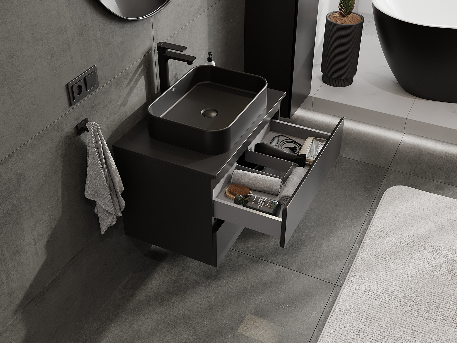 Η εγκοπή στο συρτάρι είναι σχεδιασμένη με τέτοιο τρόπο, ώστε να φιλοξενεί το σιφόνι, το οποίο είναι απαραίτητο στις εγκαταστάσεις νιπτήρων. Έτσι, το έπιπλο μπορεί να εγκατασταθεί πλήρως λειτουργικά, χωρίς την ανάγκη παραίτησης από χώρο στο συρτάρι υπέρ της εγκατάστασης.