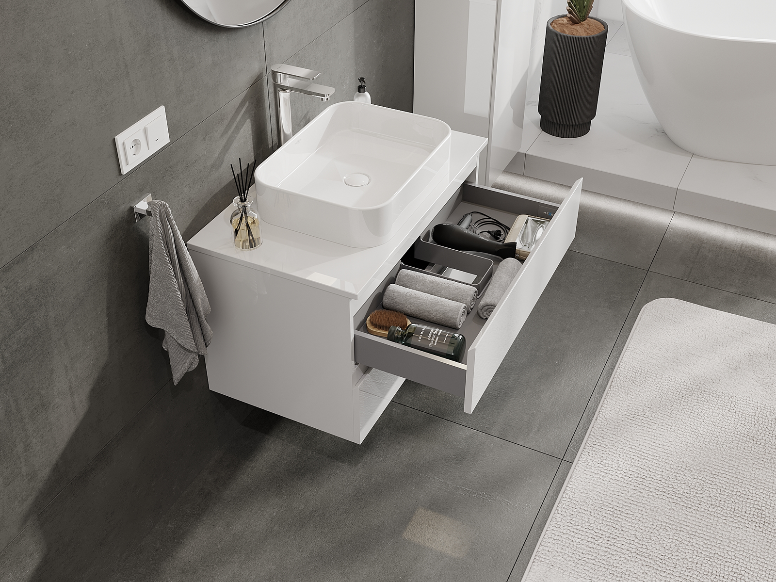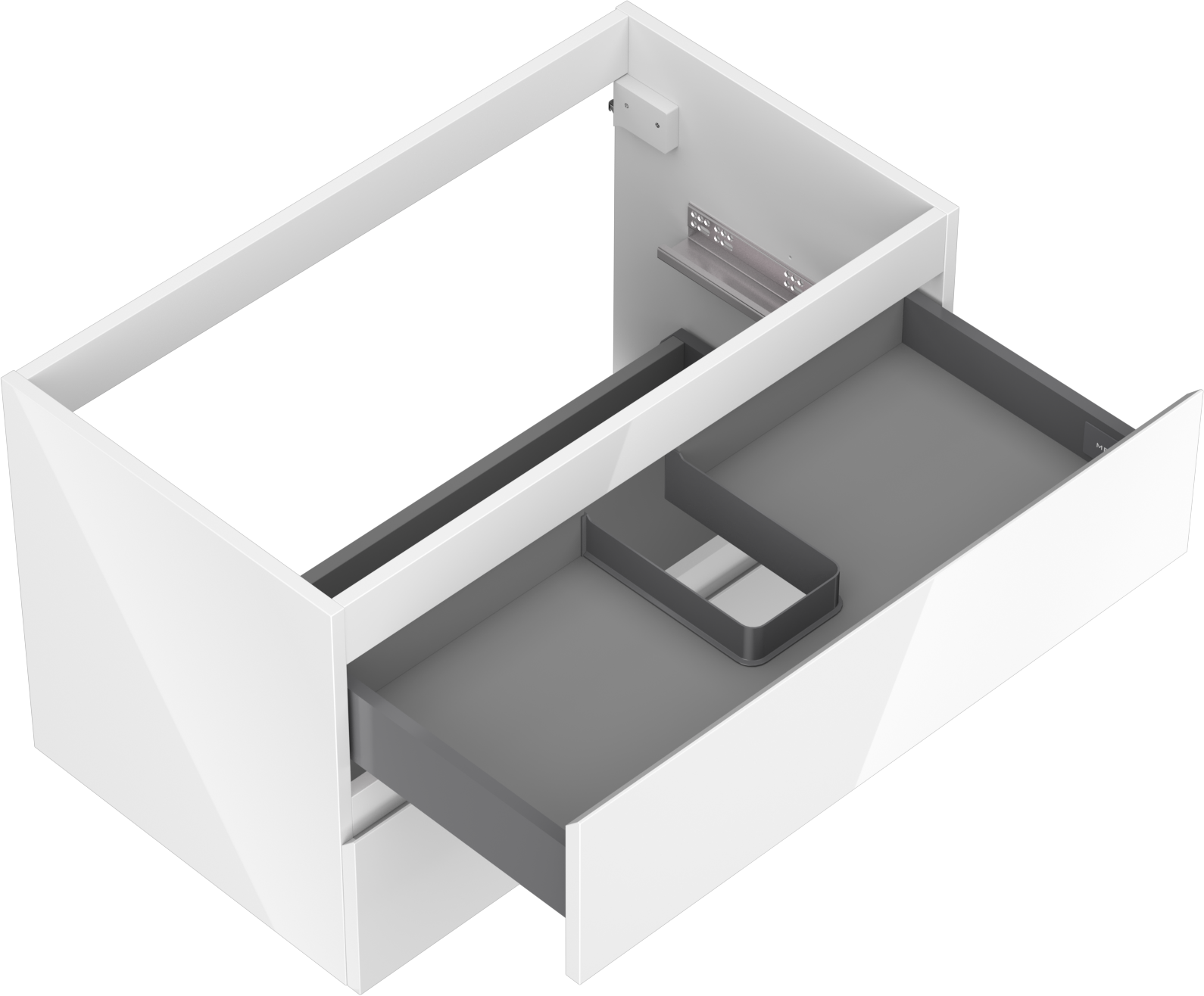 Η εγκοπή στο συρτάρι είναι σχεδιασμένη με τέτοιο τρόπο, ώστε να φιλοξενεί το σιφόνι, το οποίο είναι απαραίτητο στις εγκαταστάσεις νιπτήρων. Έτσι, το έπιπλο μπορεί να εγκατασταθεί πλήρως λειτουργικά, χωρίς την ανάγκη παραίτησης από χώρο στο συρτάρι υπέρ της εγκατάστασης.