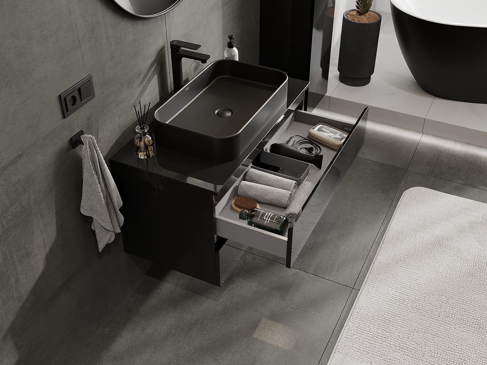 Η εγκοπή στο συρτάρι είναι σχεδιασμένη με τέτοιο τρόπο, ώστε να φιλοξενεί το σιφόνι, το οποίο είναι απαραίτητο στις εγκαταστάσεις νιπτήρων. Έτσι, το έπιπλο μπορεί να εγκατασταθεί πλήρως λειτουργικά, χωρίς την ανάγκη παραίτησης από χώρο στο συρτάρι υπέρ της εγκατάστασης.