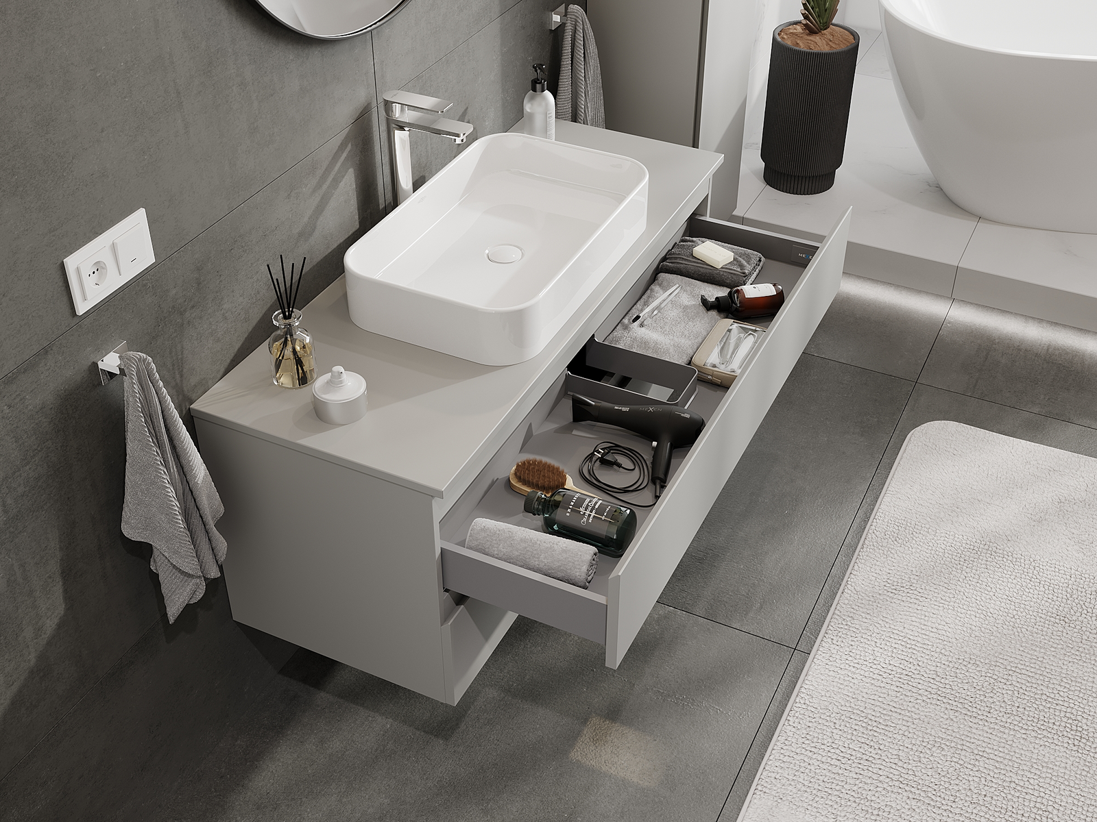 Η εγκοπή στο συρτάρι είναι σχεδιασμένη με τέτοιο τρόπο, ώστε να φιλοξενεί το σιφόνι, το οποίο είναι απαραίτητο στις εγκαταστάσεις νιπτήρων. Έτσι, το έπιπλο μπορεί να εγκατασταθεί πλήρως λειτουργικά, χωρίς την ανάγκη παραίτησης από χώρο στο συρτάρι υπέρ της εγκατάστασης.