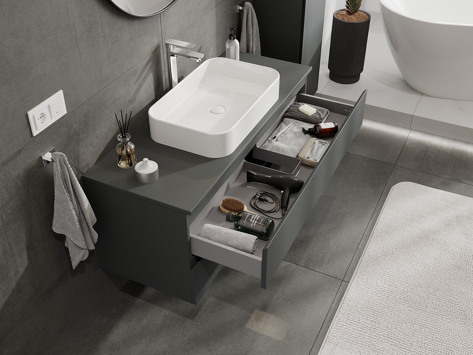 Η εγκοπή στο συρτάρι είναι σχεδιασμένη με τέτοιο τρόπο, ώστε να φιλοξενεί το σιφόνι, το οποίο είναι απαραίτητο στις εγκαταστάσεις νιπτήρων. Έτσι, το έπιπλο μπορεί να εγκατασταθεί πλήρως λειτουργικά, χωρίς την ανάγκη παραίτησης από χώρο στο συρτάρι υπέρ της εγκατάστασης.