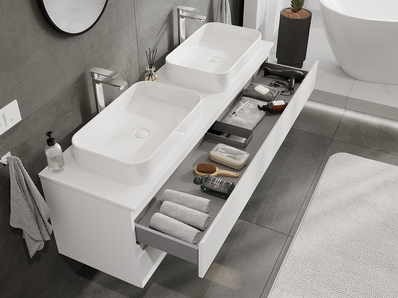 Τα αρθρωτά έπιπλα μπάνιου μας μπορούν να συνδυαστούν μεταξύ τους σε διάφορες χρωματικές διαμορφώσεις, επιτρέποντας πλήρη εξατομίκευση. Μπορείτε να επιλέξετε τόσο την εμφάνιση όσο και τις λειτουργίες των επιμέρους στοιχείων, ώστε να προσαρμόσετε τα έπιπλα στις δικές σας στιλιστικές και λειτουργικές προτιμήσεις.