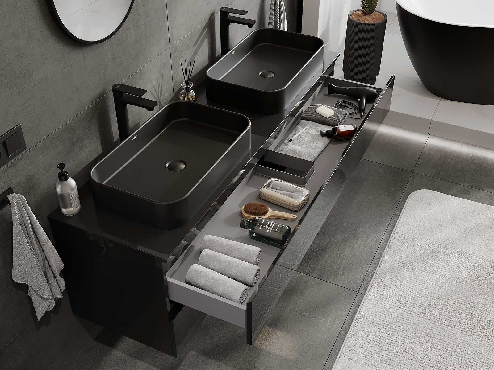 Η εγκοπή στο συρτάρι είναι σχεδιασμένη με τέτοιο τρόπο, ώστε να φιλοξενεί το σιφόνι, το οποίο είναι απαραίτητο στις εγκαταστάσεις νιπτήρων. Έτσι, το έπιπλο μπορεί να εγκατασταθεί πλήρως λειτουργικά, χωρίς την ανάγκη παραίτησης από χώρο στο συρτάρι υπέρ της εγκατάστασης.