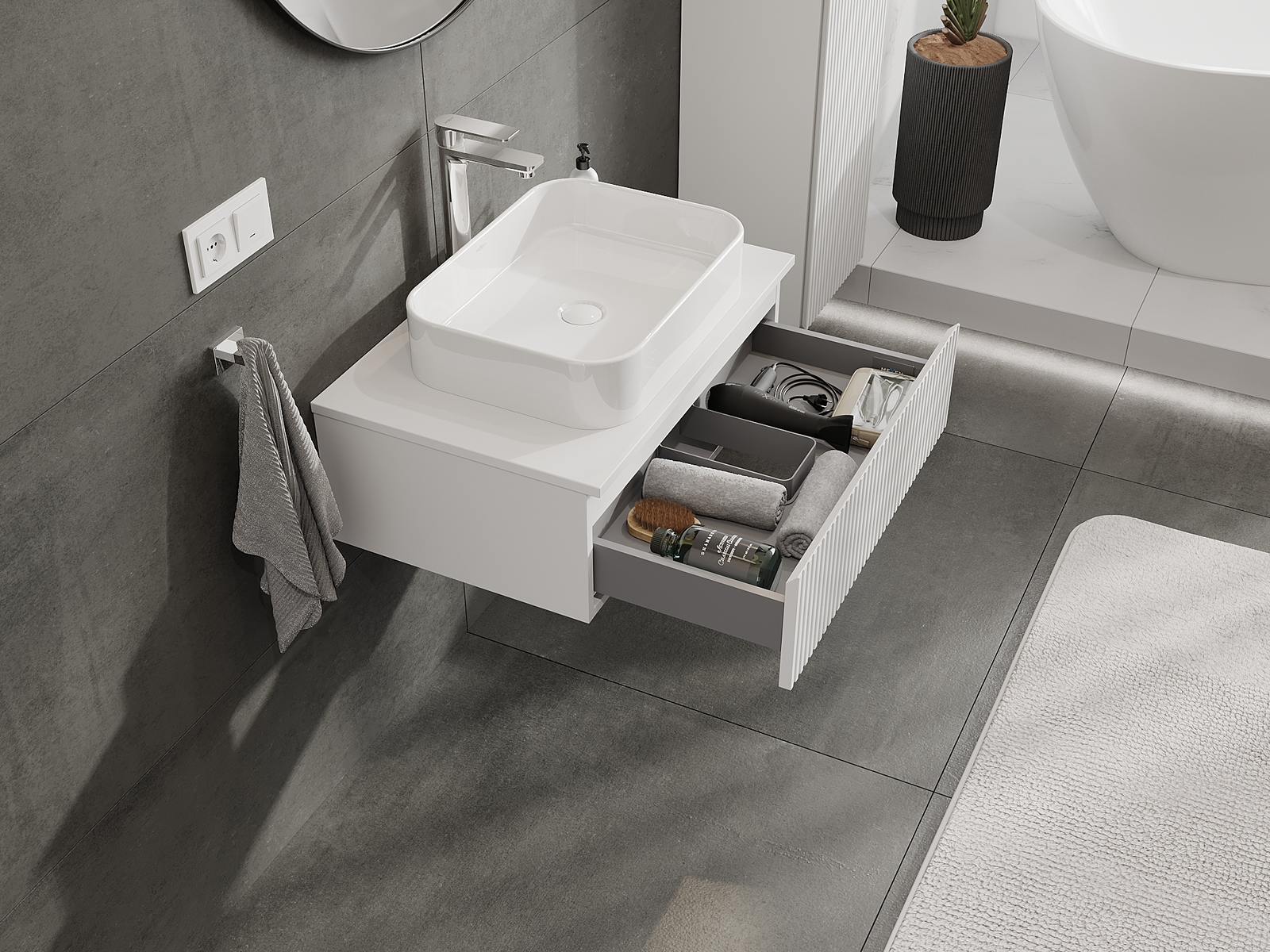 Η εγκοπή στο συρτάρι είναι σχεδιασμένη με τέτοιο τρόπο, ώστε να φιλοξενεί το σιφόνι, το οποίο είναι απαραίτητο στις εγκαταστάσεις νιπτήρων. Έτσι, το έπιπλο μπορεί να εγκατασταθεί πλήρως λειτουργικά, χωρίς την ανάγκη παραίτησης από χώρο στο συρτάρι υπέρ της εγκατάστασης.