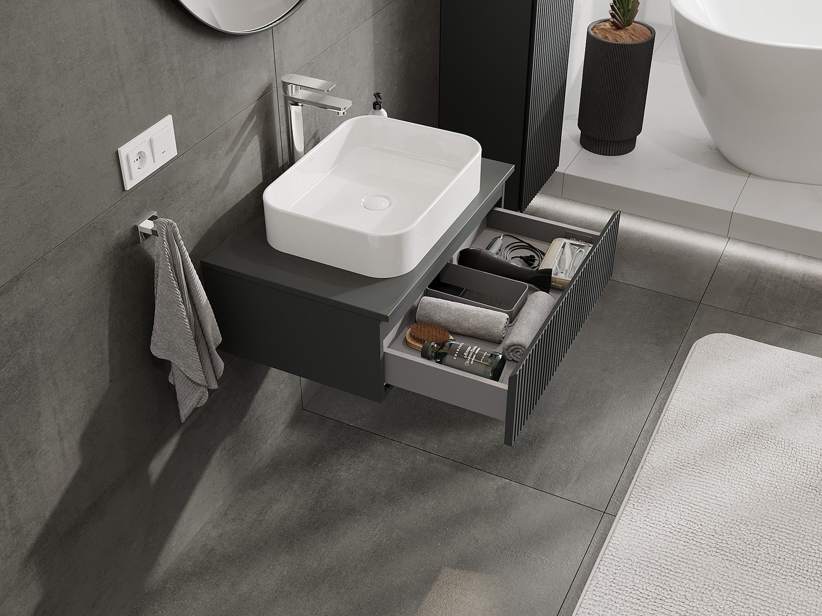 Η εγκοπή στο συρτάρι είναι σχεδιασμένη με τέτοιο τρόπο, ώστε να φιλοξενεί το σιφόνι, το οποίο είναι απαραίτητο στις εγκαταστάσεις νιπτήρων. Έτσι, το έπιπλο μπορεί να εγκατασταθεί πλήρως λειτουργικά, χωρίς την ανάγκη παραίτησης από χώρο στο συρτάρι υπέρ της εγκατάστασης.