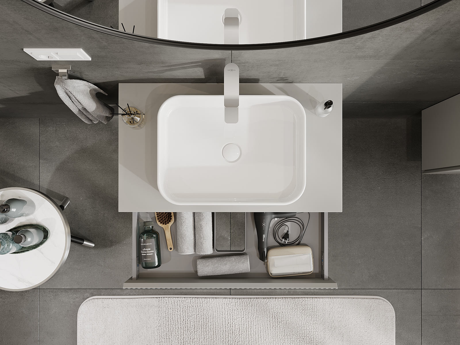 Η εγκοπή στο συρτάρι είναι σχεδιασμένη με τέτοιο τρόπο, ώστε να φιλοξενεί το σιφόνι, το οποίο είναι απαραίτητο στις εγκαταστάσεις νιπτήρων. Έτσι, το έπιπλο μπορεί να εγκατασταθεί πλήρως λειτουργικά, χωρίς την ανάγκη παραίτησης από χώρο στο συρτάρι υπέρ της εγκατάστασης.