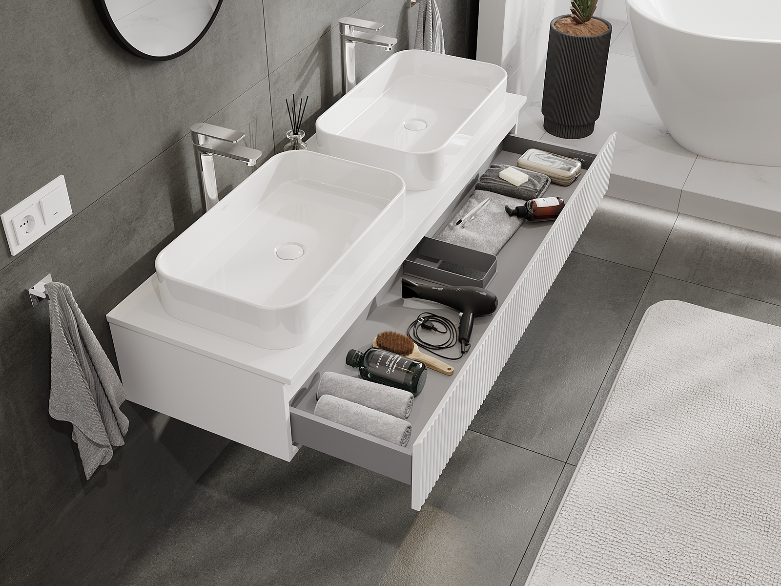 Η εγκοπή στο συρτάρι είναι σχεδιασμένη με τέτοιο τρόπο, ώστε να φιλοξενεί το σιφόνι, το οποίο είναι απαραίτητο στις εγκαταστάσεις νιπτήρων. Έτσι, το έπιπλο μπορεί να εγκατασταθεί πλήρως λειτουργικά, χωρίς την ανάγκη παραίτησης από χώρο στο συρτάρι υπέρ της εγκατάστασης.